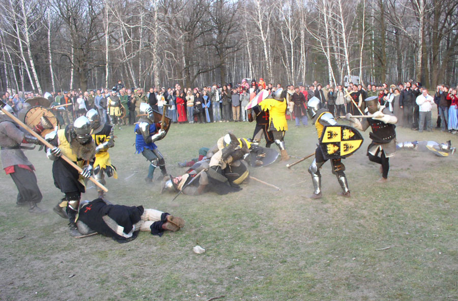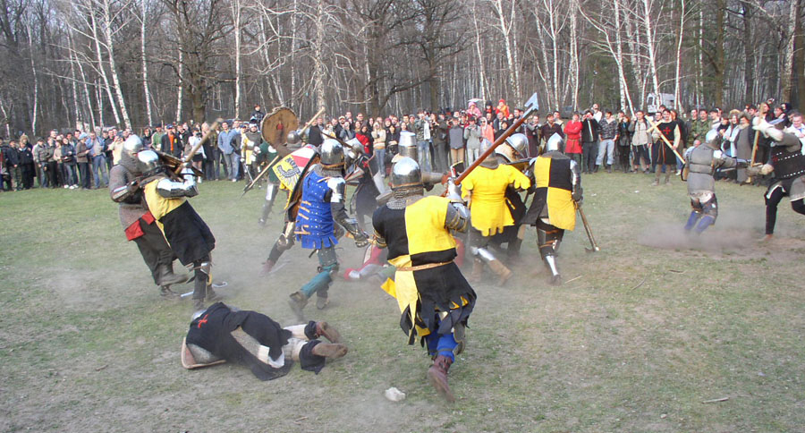 Вполне настоящие. Алебарды, топоры, мечи. Из сорта стали (наверное) под названием тексталь. Год назад при самой зрелищной битве стенка на стенку кому-то голову разбили, хотя скорее это из-за шлема. Ещё на мечах из тексталя один на один на ринге бьются.