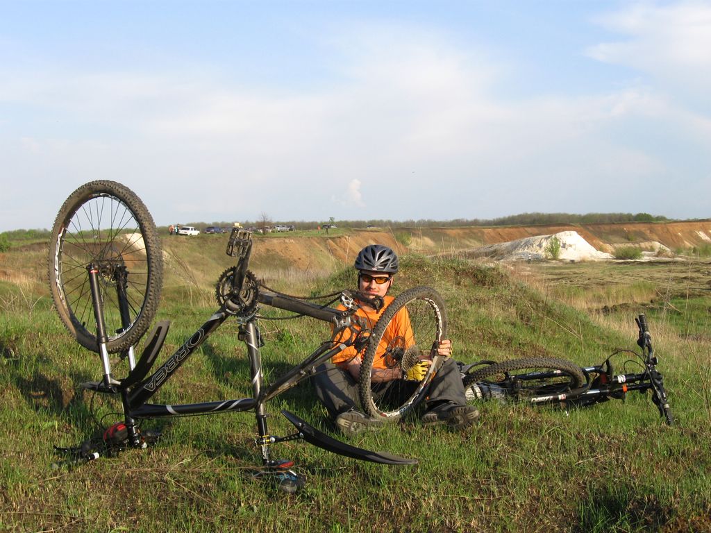 За километра 3 до места назначения у мя спустило колесо. С подкачками доехали до цели, и там Димарик показал чудеса искусства веломеханика - разбортировал колесо одними руками. Может еще кто так умеет? Но я такого еще не могу. Пока клеил дырочку, мимо нас проехали дядя с бородой + девушка (Rangifer, вы были?). Был еще парень на белой аве. Я ему покричал, помахал рукой, а он кивнул и дальше поехал. (Хто такой?)