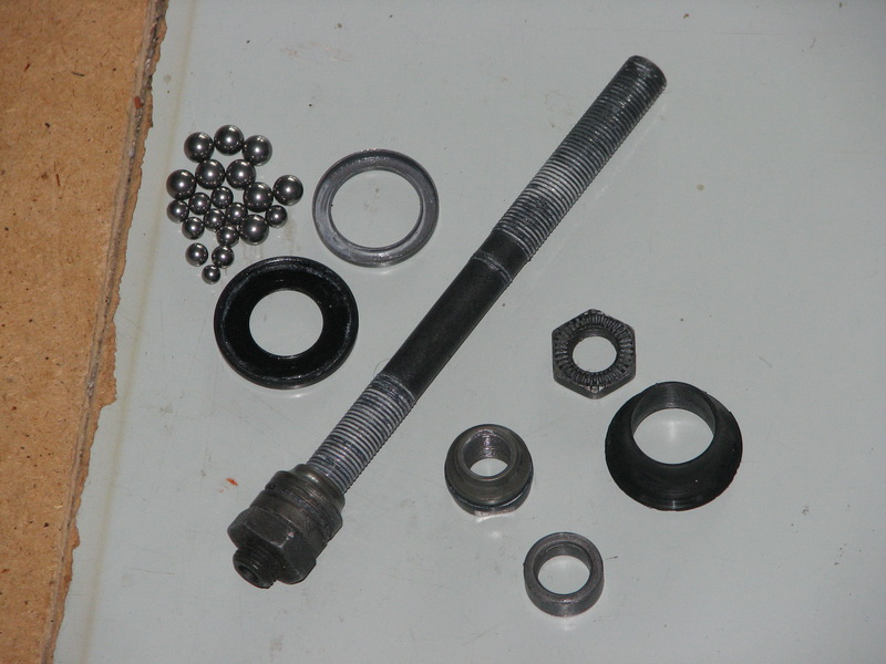 7. Отвинчиваем до конца и снимаем с оси все гайки (контрящие и конусные), а так же все проставочные шайбы, какие будут (не забудьте последовательность нахождения их на оси). Вынимаем ось и видим… под пыльником шарики.
