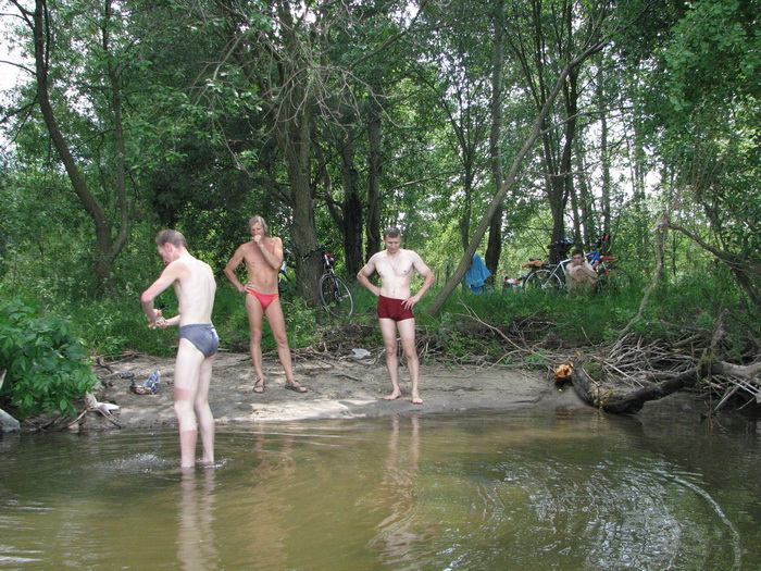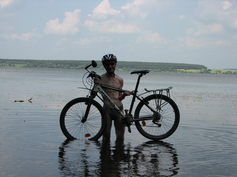 На след день нас вывезли на пляж на Водохранилище. Любопытное место, метров 20 вода едва до трусов, а потом ухххх… И рыба, рыбу можно ловить руками сам видел. Zheny тебя бы оттуда - за уши не оттащили бы. Пофоткались, перекусили, искупались и Виталик стал учить народ велоремонту, став для велотавров гвоздем программы на последующие два дня. В Осколе и Губкине все хорошо с дорогами, да мастеров такого класса как Кипер днем с огнем, все так запущено, что приходится в Воронеж ездить. Виталик явил чудо и гибрид Валеры после некоторых манипуляций снялся с ручника и поехал, даже полетел учитывая накат и узкие слики. Вдруг небо начало чернеть и налетел шквал. Лесопосадка задрожала и зашаталась. Пора была уносить ноги. Увы… Ливень с градом накрыл нас однозначно и без вариантов. Мы неслись что есть духу к остановке на трассе, а мощно полоскавший дождь переходил в град, и гремел над головой, словно небо с треском разламывалось на части. На остановку влетели мокрые насквозь и вовремя – обрушилась просто стена дождя и пошла на Воронеж. С возвращением по грунтам можно было распрощаться. За пределами асфальта все превратилось в кашу.