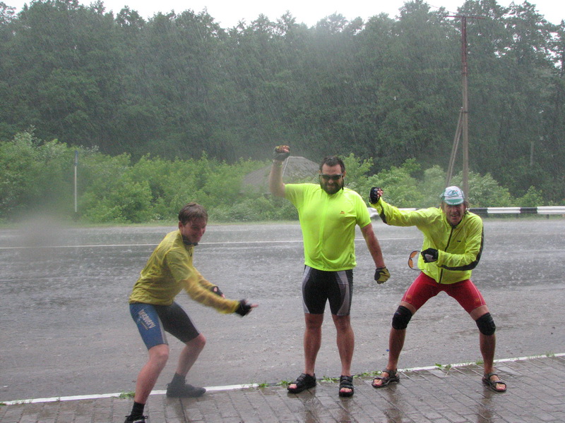 В Острянке встретили Сашу ака T_Dev и Валеру, который ждал нас целых 5 часов. Выдули всю воду у них, ополоснулись под колонкой, и, пока шел долгожданный ливень, уминали гуманитарную помощь.