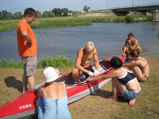 Утро после бурной пятницы и полубессонной из-за жары предыдущей ночи выдалось не то чтобы сильно добрым. Будильник был благополучно выключен, голова переложена другим ухом на подушку, заказанный сон продолжался. Но тут раздался душеспасительный телефонный звонок, который таки напомнил, что долго спать вредно, и вообще нужно зачем-то вставать и куда-то двигаться. Нисмотря ни на что, форум был успешно прочитан, завтрак съеден, часть забытых вещей вспомнена и упакована. На месте сбора оказался ровно вовремя, обнаружив там уже полусобранный таймень имени единственного полностью женского среди нас экипажа, а так же всю закупленную на нашу поездку воду-еду. Остальные как водится появились через полчаса. Всего собралось ажно 10 человек на 5 байдарках, а могло бы быть и больше.