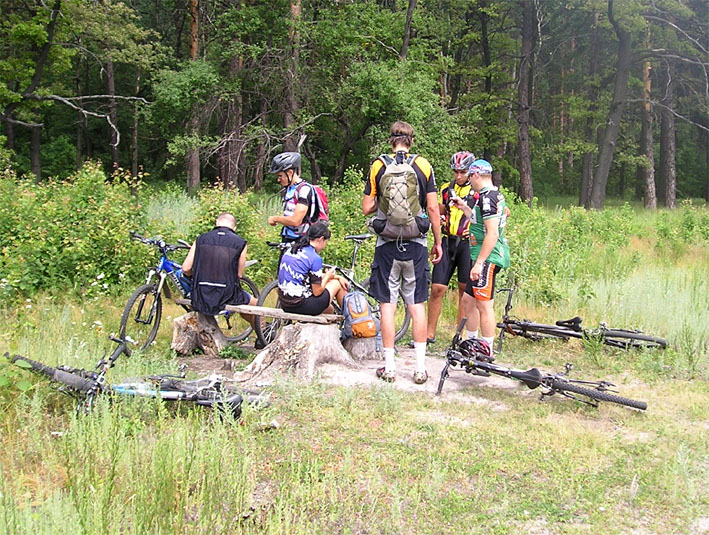 Отличный маршрут получился, правда короткий, хоть и темп сегодня был ближе к матрасному, но к концу немного торкнуло. А все потому, что на околице города залезли в лес и 100 км из него не вылезали. И никаких Вам аствальдов, практически ни километра. И никакой тошнотворной шири полей. Лес, лес, лес, местами песочек, в качестве приправы. А под виадук то я приехал один. Нет никого, хотел, было двигать на Венек к Rangifer вдруг отовсюду полезли велосипедисты Zheny, Simvol, DM76, VladimirI, Nedjmdin. На другой стороне рельсов обнаружился Mouse Alexander. Тщательно подобранными огородами двинули за ВладимиромИ на брод. На той стороне брода ждал Leon. После брода, незнакомыми буераками и железными помостами добрались до Венька. Там встретили Rangifer и отправились опустошать магазин на Маклоке. Где прокололся Zheny первый раз, я что то подзабыл, а всего он кололся 4 раза и все четыре раза - удачно. Еще на Веньке позвонил первый раз Владимирович и сообщил, что он уже в Бору. А мы с Маклока поехали в сторону Бора грунтами и вскоре стали пленниками лесных дорожных кружев. Дороги шли, замысловато огибая болота, во все стороны, кроме Бора. Нас мотало по ним, ничуть не приближая к цели. Сказать, что заблудились было нельзя - направление в котором нужно было ехать мы знали, но ни одна дорога туда не вела. Mouse Alexander, утомленный ночной покатушкой, сошел с дистанции. Включили ГПС, который показал нужную дорогу невдалеке. Нашли ее и доехали до Бора. А там нет никакого Владимировича. Из за паршивой связи звонили ему хором. Дозвонились. Оказывается он успел укатить в Графскую. Поехали в заповедник за черникой, по дороге на Ступино. Обнаружив чернику, немедля принялись ее собирать неистово, и собирали около часа. Этот процесс затягивает и отрываешься от него с трудом. Удалось оторваться и поехать по дороге на Пчельники до моста через Ивницу. В Пчельники не хотелось, а хотелось куданьть поближе к Кудеярову городищу. По другой дороге поехали в сторону Бора, высматривая поворот на восток. Такого поворота не нашлось, оказались в Бору на переезде. Оттуда поехали в Графскую лесом, а не вдоль привычной железки. Заскучать не давали проколы Zheny. Это уже после Графской и четвертого прокола из покрышки наконец вытащили стекло. Теперь ничто не мешало отдаться дороге, по которой умело вез ВладимирИ. Вылезли на Маклок там же где и влезли. Потом Венек- до свидания, Рангифер, потом брод. Владимир и Леон поехали на Маяк, а мы - проделывать дырку в колючке отроженского водозабора. Старую дырку с остервенением кто-то затянул новой колючкой. Для нас это было равнозначно как если кто-нибудь на М4 наставил танковых ежей против фур. С негодованием проход проделали заново. Тут и Отрожка показалась. О ее приближении сигнализировали кучи мусора в лесу, оставленные ее маргинальными обитателями. Надеюсь, что карающий сапог правосудия доберется и до них, убогих. А всем участникам сегодняшней инспекции спасибо. До встреч!