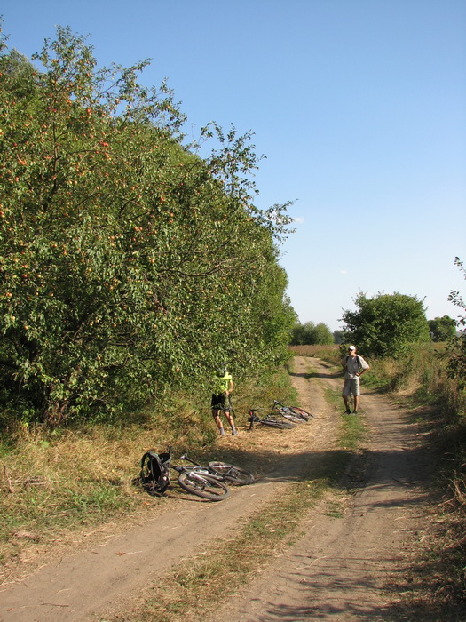 Так, немного покатались. :oops: У меня всего 170 набралось. Сначала проводили хард эдишн до нововоронежского моста. Там перекусили и решили на обратном пути той же дорогой встретить липчан, что сегодня с ж.д. вокзала ехали в Сторожевое. По всем расчетам они нам должны были встретиться где-то на пол-пути. Как назло я неудачно перепрыгнув выступающую плиту приземлился четко задним колесом в самый ее край и пробил таким образом камеру. Зачинились быстро, ожидая липчан, но они не появились. Ну что ж поехали дальше. Вот уже до плотины осталось каких-то 10-15км, а никого встречено не было. Сделали привал и перекус. Прикинули что в 16:00 быть дома не комильфо и поехали обратно к нововоронежскому мосту с расчетом вернуться по нововоронежской же трассе. Теперь на пол-пути с третьего раза заметили яблоню с маленькими красно-полосатыми яблочками. Накинулись. Набрали. Поели. Еще набрали. И о чудо! Со стороны Воронежа показались велосипедисты. Липчане. Однако долго мы их встречали :D Теперь поели яблок совместно с липчанами, у которых, как оказалось иссякли запасы воды и сочные яблоки оказались им кстати. К несчастью у нас запасов воды тоже практически не осталось. Ну что ж, вперед, к воде!