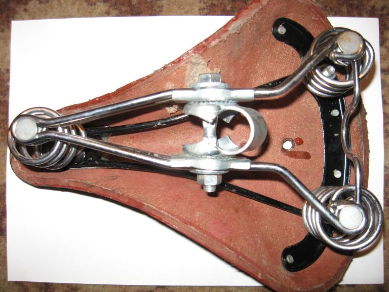 В связи с приобретением временного кетайского седла отдам в дар поломастое псевдосоветское седло. Поломалась чёрная задняя железячка (см. вид снизу) в районе вторых с краю заклёпок.