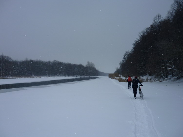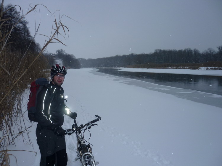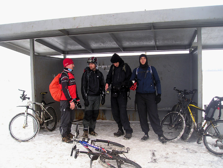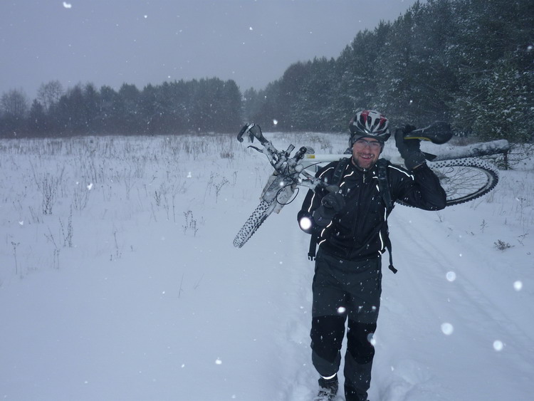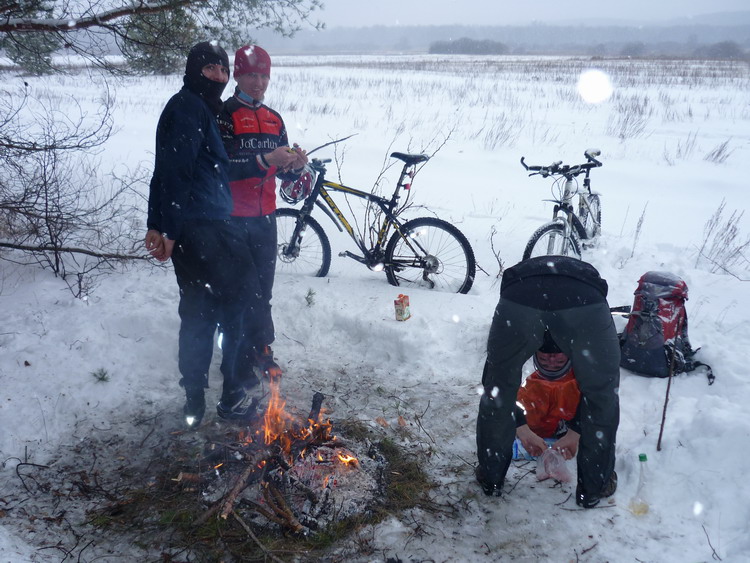 Снегопад уже разыгрался вовсю. Снега в лесу очень много, но вылезли на Излегощу и немного проехали по льду ,поближе к сосняку, чтобы, наконец культурно отдохнуть. Пришлось еще полезть заснеженным лугом, но, наконец, дошли. Развели костер и начали культурно отдыхать. Устрашали масштабы снегопада и скорость нарастания снежного покрова. Дорогу, а точнее непригодную из за рыхлости колею внедорожника быстро заметало. Так, что когда тронулись шли до начала Нелжи пешком, а потом и до середины Нелжи, пока не начался асфальт, угадываемый шестым чувством. Но все – таки ехать было можно. Совсем уж темнота застала у института сахарной свеклы, после Рамони. Поехали туда, а потом на М4. Если бы двинули на Маклок, думаю бродили бы еще в километре от него и сейчас. Ощутимо холодало, но ветер был попутный. У Олимпика удивлению нашему не было предела. Словно и не было холода. Снег сменился дождем, а температура стала плюсовой. Ну и чудеса! На охлажденный, не успевший нагреться металл велочастей намерзала вода. Последние километры я ехал с ужасным треском проскакивающей по кассете цепи. Кассета превратилась в кусок льда. Где –то 130 км все удовольствие заняло. Увидимся.