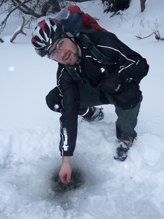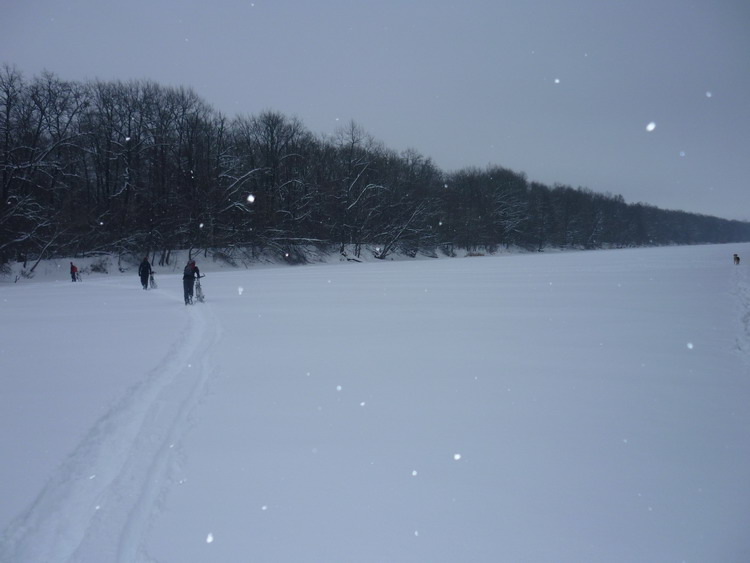 Отметили с ВованомББ, Радлером и Неджем кровавое воскресенье на славу. Был еще Жени, но доехал с нами до рамонского поворота и повернул обратно. У него были неотложные дела. До Сенного, по М4, а потом через Сергеевку – Карачун – Глушицы доскакали довольно быстро. Дорога имела колею, протоптанную до аствальда, правда ветер был встречно – боковой. У сенновских дач пришлось спешиться и идти к реке пешком по снегу. Тем временем начался снегопад, который все время усиливался. Воронеж у Сенного, там где впадает Излегоща как и в прошлом году не замерз. Пошли вниз по льду вдоль полыньи. Метров через 500 полынья изчезла. На другой берег вела рыбацкая тропинка. Удачно перешли по ней, хотя на дереве у реки на той стороне виднелось напоминание о чьей то менее удачной прогулке по льду. В лунках лед был толстый. В отличие от водохранилища, интересно было смотреть как вода в лунке довольно быстро течет. Дальше предстояло лезть через бурелом к Излегоще