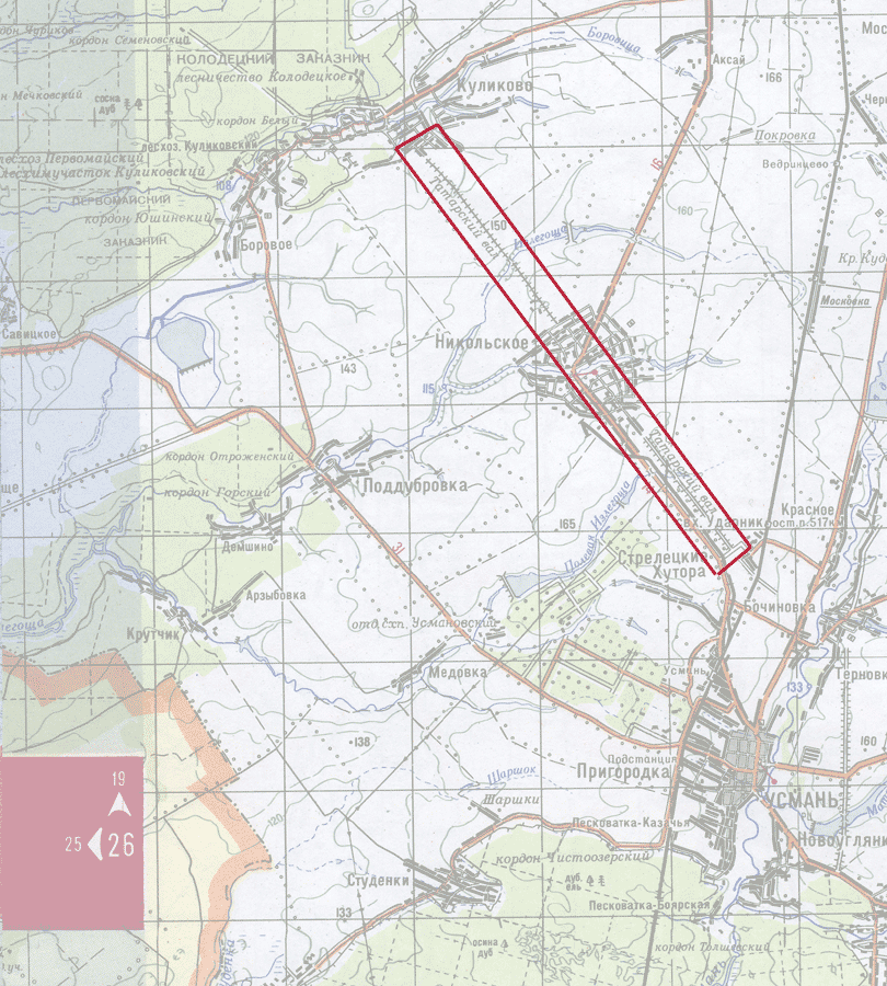От Т.В. и Поддубровки, через Демшино , Нелжу и Ступино к Ступинскому мосту, по которому вы переезжали Воронеж в Усманском походе. Это не по границе заповедника, а севернее.