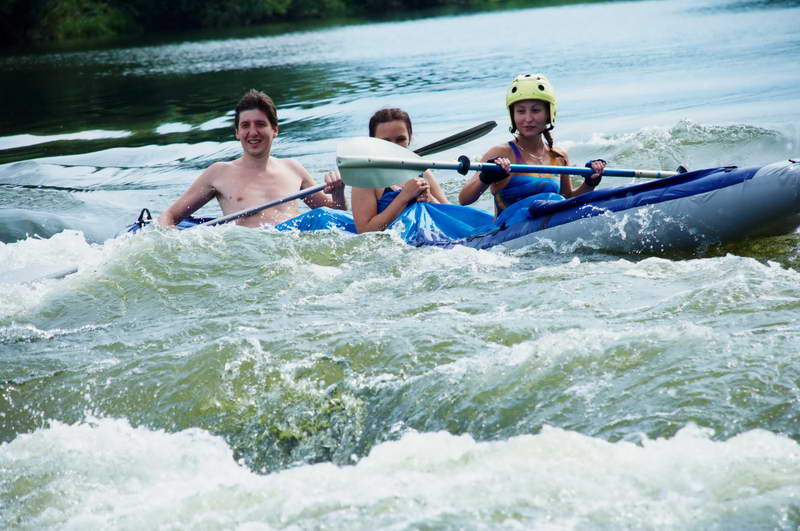 Нас пугали, что там соревнования, и народа будет не пропихнуться, однако на деле всё оказалось наоборот, людей было не много, причем все позитивные, порог размечен воротами, что помогло освоиться к сливам, ну и спасательный катамаран тоже внушал доверие на всякий там непредвиденный случай. До разбивки лагеря быстро накачали нашу лодку Щука-3 и ринулись на порог. Ввиду наличия всего одного весла на трехместной байдарке были заведены знакомства с целью поживиться веслом (как потом выяснится, одного весла достаточно, а неумелый матрос с веслом только мешает). После 2-3х сплавов на берегу выстроилась очередь, умоляющая прокатить на нашей «сосиське», что мы легко и делали – садились даже дамы с малыми детьми! – и наша Байда превращалась уже в 4-х местную.