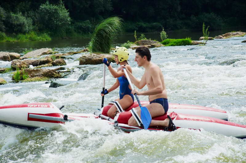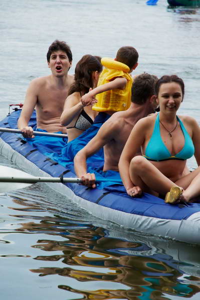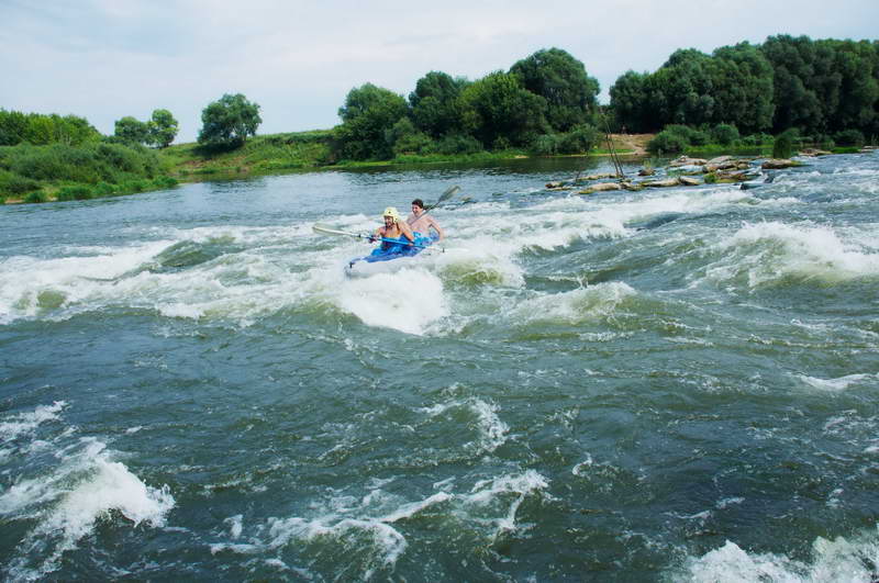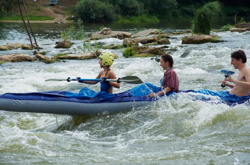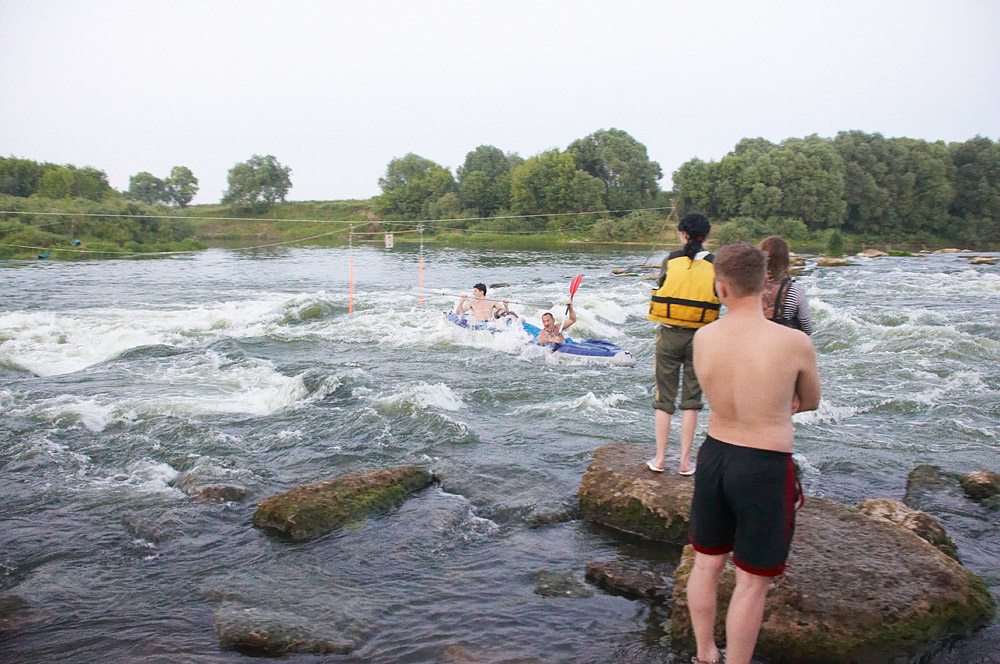 Нас пугали, что там соревнования, и народа будет не пропихнуться, однако на деле всё оказалось наоборот, людей было не много, причем все позитивные, порог размечен воротами, что помогло освоиться к сливам, ну и спасательный катамаран тоже внушал доверие на всякий там непредвиденный случай. До разбивки лагеря быстро накачали нашу лодку Щука-3 и ринулись на порог. Ввиду наличия всего одного весла на трехместной байдарке были заведены знакомства с целью поживиться веслом (как потом выяснится, одного весла достаточно, а неумелый матрос с веслом только мешает). После 2-3х сплавов на берегу выстроилась очередь, умоляющая прокатить на нашей «сосиське», что мы легко и делали – садились даже дамы с малыми детьми! – и наша Байда превращалась уже в 4-х местную.