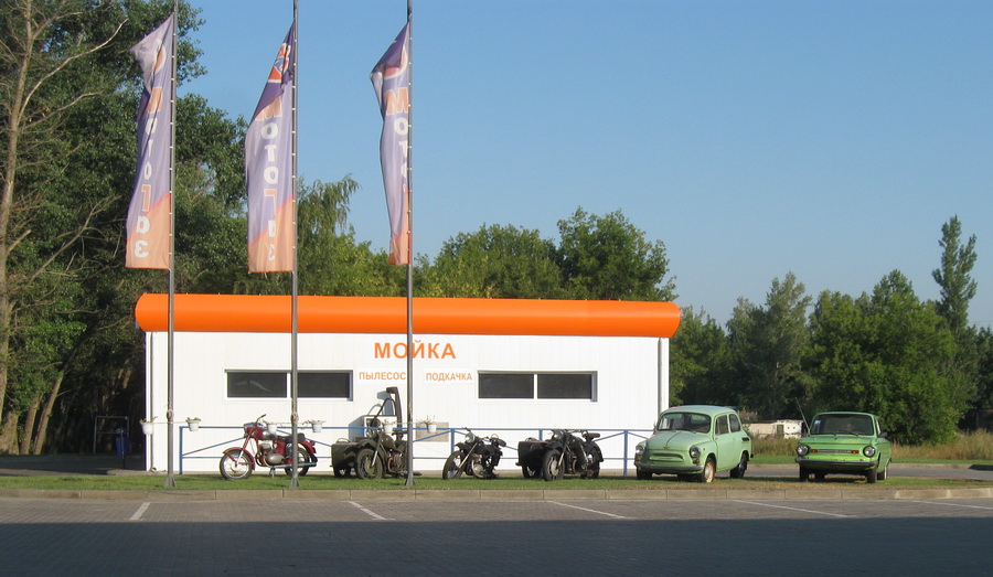 Традиционно, ворожежцы опоздали на страт. Точнее приехать-то они успели, а вот отогнать машины на финиш и вернуться уже не очень. Но поскольку на старте присутствовало TV и им неплохо было бы заснять массовку - все нас ждали. В результате старт вместо заявленных 9 был в 9:40. Помахали участникам на первом повороте и разъехались кто куда. Воронежская машина поддержки по плану должна была выполнять роль судейской и встречать всех на КП2 в Судже. Это 280-й километр пути. Приехали мы туда рано и ждали долго. К тому же меня начало нехило колбасить толи от отравления, толи от перегрева. Ждать было тяжко. Радлер с безбашем очень хотели уложиться в сутки, поэтому на этом КП мы их ждали часов в семь. Ан нет, дождались только в девять. Ещё один участник, ехавший изначально с ними третьим, как оказалось где-то на 120м километре отстал и сошел. Первая жертва ацкой жары.