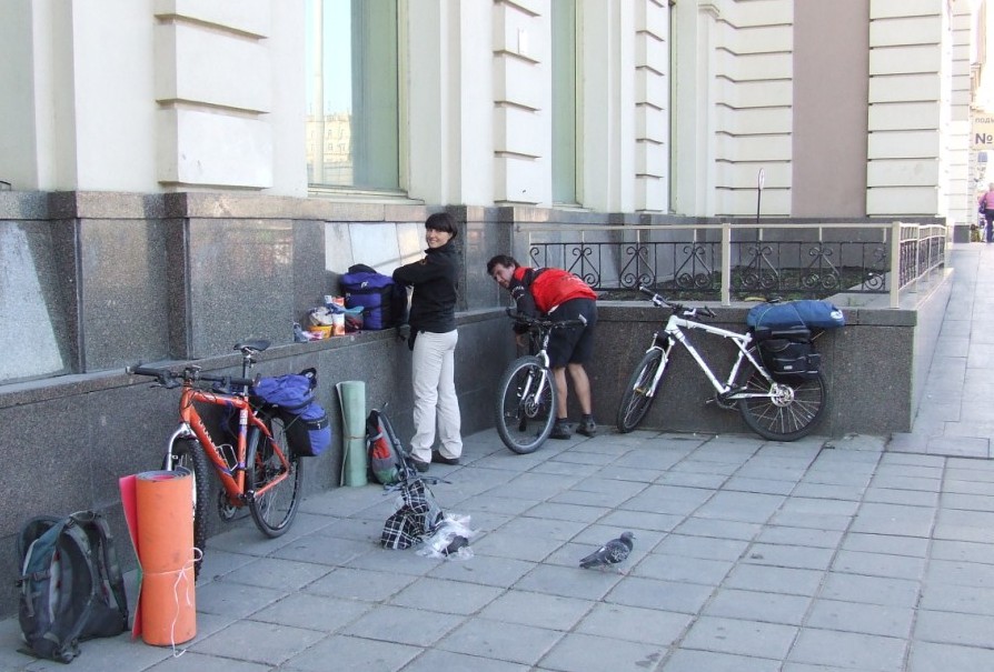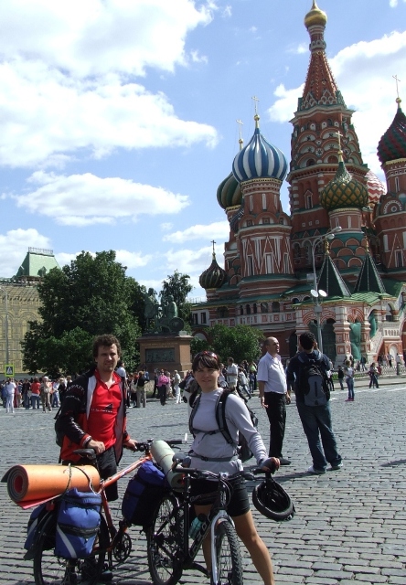 Ближе к обеду мы приехали на Красную площадь, но добросовестные стражи порядка нас быстро оттуда выпроводили. Встретили группу велосипедистов из Питера, они приехали на денек покататься по городу. Один из них зачем то оставил Радлеру свой телефончик и передал пламенный привет Метеору.