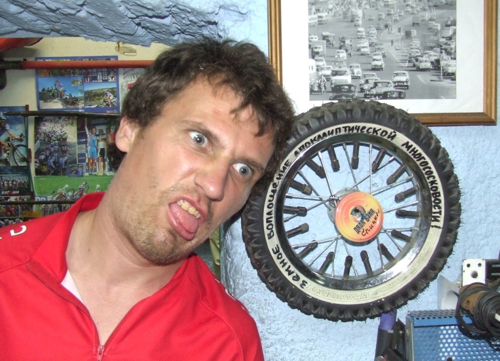 Прямиком с вокзала мы отправились на велобазу - злачное местечко, где Вован проработал несколько лет. Там до сих пор лежит ящичек с инструментами с надписью "Владимир Москвичев", а над столом механика висит Вовочкина фотография. Очень романтично.