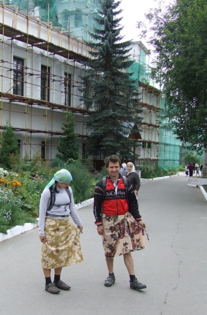 У ворот нас заставили оставить велосипеды, потом охранники отказались выдывать Радлеру с Вованом юбки (привычные после Звенигорода), Сказали чтобы проваливали отсюда в ТАКИХ неугодных Богу одеждах. А дождь все усиливался... а мы поехали прочь, раз уж велосипедистам не везьде рады.