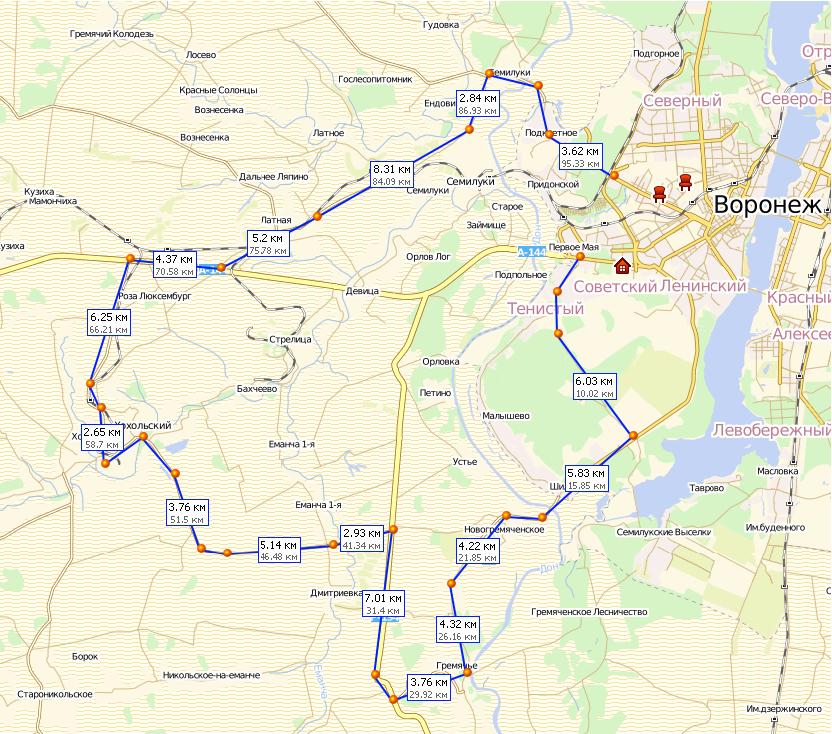 Маршрут круговой: 1-е мая - Шилово - Гремячье - Хохольское - Латное - Семилуки - ул 9-е Января финиш.