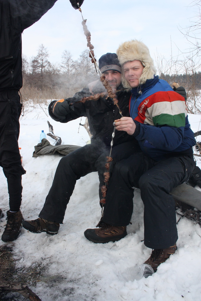 приятно осознавать, что в четвертый подряд год. мы собираемся на мероприятие в честь дня защитника отечества. дико переживал по случаю своего опоздания к цирку, еще удивило то, что из дали никого не было видно. оказалось четверо во главе со Стасом прятались внутри. по пути остановились затариться углем, и тут мимо промчал Радлер. догоняя! его мы все больше сомневались в том, что это именно он, оказалось что у него убита трансмиссия и он передвигался на малом ходу. бродили не долго, шашлык ели не долго, вернулись посветлу! но дорога домой оказалась гораздо сложнее. дул сильный ветер, и у меня замерзли ноги. но как и было сказано, мероприятие состоялось несмотря на не тепличные условия. рад что шашлык понравился, я правда старался