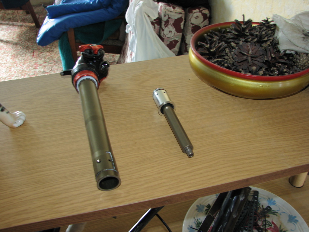 1. Освобождаем подседельник от всего, что мешает его разобрать (вынимаем из рамы, снимаем седло, трос, защиту от грязи, пыли), и, открутив гайку снизу (с торца черной трубы подседельника) головкой на 10, а так же красную шайбу с резиновым пыльником в ней, разбираем его.