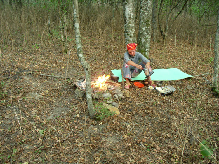 И поехал. Вот ведь, ну тогда хватит идти, пора отдыхать, хотя у меня стойкие подозрения что он под полной дорогой имел ввиду и дорогу вниз, что вообщем то не так нас интересует и что мы уже почти забрались на эту гору. Минут через 5 находим съезд вбок и даже место для костра, обложенное камнями. Тут и остаемся.