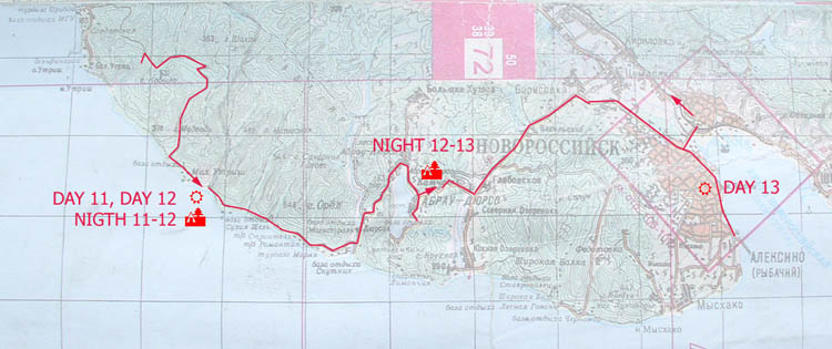 По пути на холм у меня была идея заночевать в красивых посадках которые мы видели по дороге, но желание увидеть озеро пересилило и вот теперь в сгущающемся сумраке надо быстро найти место для ночевки. С холма видим кусок пляжа на озере и дорогу на холм. Спускаемся к пляжу -- много мусора да и место открыто для просмотра всем вокруг, пытаемся найти дорогу на холм которую видели с высоты -- тоже неудачно, вообщем кругом озера или дома или обрыв, а где ночевать не ясно. Становится совсем темно. Возвращаемся чуть назад к дороге которая ведет уже на Новороссийск. Начинаем ехать по ней. Уже в полной темноте видим какой то съезд в лес, забираемся туда, везде достаточно покато, но находим место с уклоном который хоть как то подходит для сна. Ставим палатку, ложимся спать. Опять какие то постоянные шорохи, только на этот раз в виде хруста ломающихся веток. Я практически уверен что это снова какое нибудь животное, т.к. люди тут явно ничего не забывали, вообщем вскоре засыпаем. Спим, переодически сползая вниз