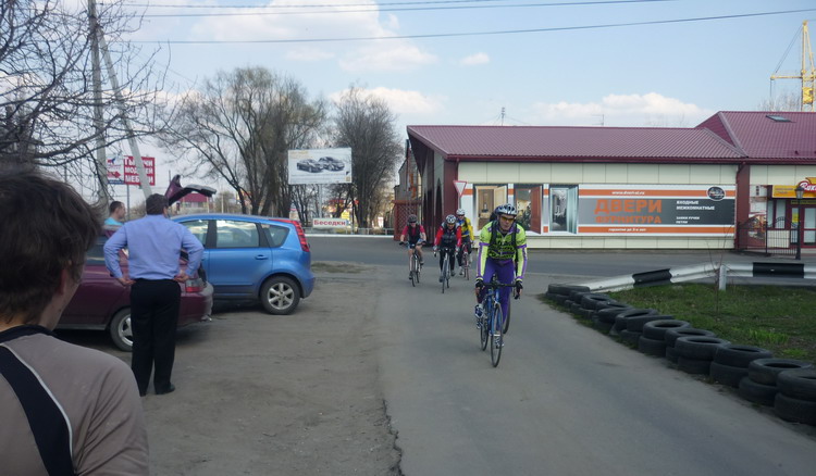 Вернемся на маршрут. Путь туда я запомнил нехорошо. Потому что доехали быстро. Помню аиста в гнезде у дороги. Когда вперед становился Жени, по случаю надвигающейся Пасхи одетый в форму с черепами и аццкими пентограммами, он по обыкновению начинал рвать в подъемы, подворачивающиеся на маршруте. К счастью, подъемов почти не было. Трасса плоская. Ветер туда был непонятный. Скорее, попутно-боковой. За пять километров до КП в Марьино с какой то тайной целью вперед в отрыв ушел Радлер. К тому времени от рюкзака и вобще у меня начала ныть спина и я предвкушал короткий отдых у магазина на КП. Этого не произошло. Оказалось, что Радлер до нашего прибытия успел пробить шесть чеков и, не останавливаясь пришлось разворачивать оглобли и запрыгивать в уходящий поезд ВованаББ. В поезд запрыгнули четверо. Кроме Вована, Владимир Сибиряк, Жени, СДА и я. Принц Проколыч Радлер счел свою миссию выполненной и тут же с успехом прокололся.