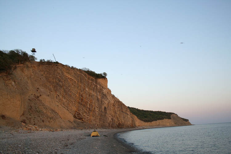 Но решаем проехаться по берегу дальше. Доезжаем до места где дорога снова идет на холм, оно нам нравится и решаем там и остаться. Народа почти нет, море, вид отличный, рядом какой то странный ларек -- такое впечатление что какие то чуваки решили отдохнуть на море и заодно совместить это с торговлей. Цены и в этом ларьке и в небольшом магазине в поселке (если несколько домов можно назвать поселком) большие, что вообщем то объяснимо -- по такой дороге надо сюда еще доехать с товаром.