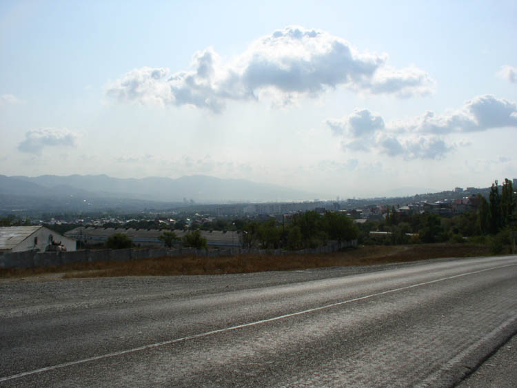 Вечером нам предстояла серьезная задача -- впереди был подъем на гору 500 м высотой. Так как дорога грунтовая, я на всякий случай спрашиваю она ли это у водителя какой то машины -- он говорит что нет. Я ему не верю (тока не надо уточнять зачем я тогда его спрашивал -- для статистики ;) ) и мы лезем по какомо то невероятному для дороги уклону вверх. Минут через 15 оказываемся перед развилкой и шлагбаум перекрывает одну из дорог. Юля фоткает вид с высоты, я иду к посту. Там сидят два парня.