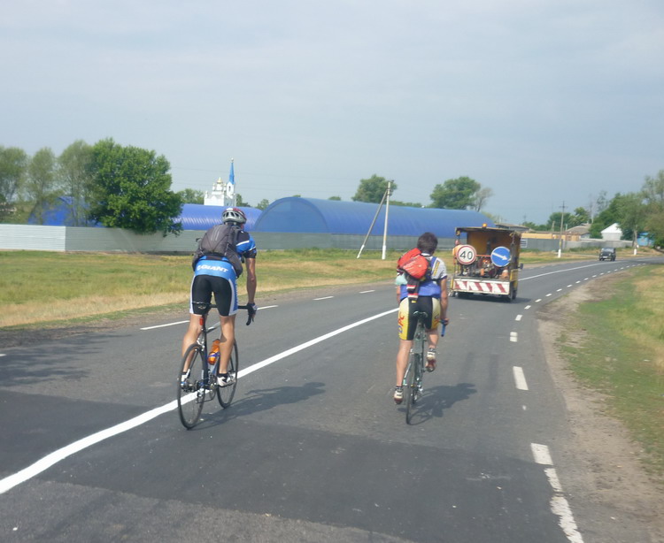 Все таки доехали до автостанции в Обояни и напали на чай и выпечку в ларьке. Колено прошло после сидения на корточках около ларька, когда нога в этом колене максимально согнута. На выезде из Обояни прокололся Вован. 70 км до Суджи мне представлялись малореальными, хотя проехали всего 200 км. Вдобавок от кофе, апельсинов и изотоника начался дикий гастрит, который мешал ехать все оставшиеся 400 км и сдерживал общий темп. Выражение "тошнить по асфальту шестисотку" становилось буквальным. Развлекались покорением следовавших друг за другом тырчков. Догнав машину, обновлявшую разметку на дорогах, Радлер, с его обостренным чувством прекрасного, пользуясь случаем, побелил покрышки. К этому времени внутренние часы окончательно съехали. Было ощущение, что не 11 утра, а 5 –6 вечера. Километров за 15 до Суджи увидели двух рандонье, изучавших устройство шоссера, поставленного вверх тормашками. Это были БадАдмин и АлексХХЛ С помощью Вована изучение удалось превратить в ремонт и дальше поехали впятером, вызвонив Неджа, чтобы встречал в Судже. Так и вышло. С заправки нас выгнали, поэтому перекусывали на той же обочине где и год назад с Семеном и Любой. Дальше по маршруту лежало Коренево, куда поехали двумя группами, опережая друг друга. На тырчке перед Коренево мысленно отметили половину маршрута. Проехать еще столько же казалось фантастикой. Проклятый гастрит донимал. Вдобавок я прокололся. БадАдмин и АлексХХЛ проехали до магазина дальше, потом решили нас не ждать и ехать в Глушково, но прокололись сами и отстали. К этому моменту духота достигла максимума. Здорово парило. Вместо сауны, как в прошлом году, теперь была влажная русская баня. Рассмотрели при свете дня дорогу до Глушково. С самого Солнцево впереди бессменно ехал Вован. После Глушково и моста через Сейм начался 30-ти километровый участок, который в прошлом году мы ехали, выспавшись в Глушково на КП, а теперь вот ехали невыспавшись. Спуски и подъемы следовали друг за другом, а Рыльск все не появлялся. В конце концов, когда он появился, его уже не хотелось. Так всегда в жизни, а бревет – довольно точная модель жизни. Знакомый по 400-ке кусок от Рыльска до спального КП поразил яростно утоптанным какой-то техникой и посыпанным щебенкой аствальдом на подходе ко Льгову.. Про спальное КП на 450-м километре можно сказать:. лучше поздно, чем никогда. Олег и Хаджи с традиционным гостеприимством встретили нас. Есть особо не хотелось. Особенно мне. Поэтому прилегли и попытались часок – два поспать. Не удалось. Вован под предлогом доступа свежего воздуха, напустил в палатку комаров, сон был сорван, и мы решили ехать дальше. Тут подтянулись БадАдмин и АлексХХЛ . Бочаров, стартовавший утром , тоже был на подходе. Он демонстрировал впечатляющий темп. В быстро наступавшей темноте поехали на Конышевку. Въехали в нее как раз по истечении суток с момента старта. Предстоял длинный, нудный кусок до Фатежа, не предвещавший извлечения из него кайфа. Вдумчивый читатель, знакомый с моими отчетами о 200-ке, 300-ке и 400-ке, наверно уже заметил подвох. А как же Принц Проколыч? Вован кололся, я кололся, а Радлер? Неужели карму вычистил. И вот под покровом ночи на выезде из Конышевки это случилось. БАБАХ! По звуку сразу было понятно, что это не простой прокол. Обнаружили дыру, протертую в покрышке. Видимо результат резкого торможения при стол