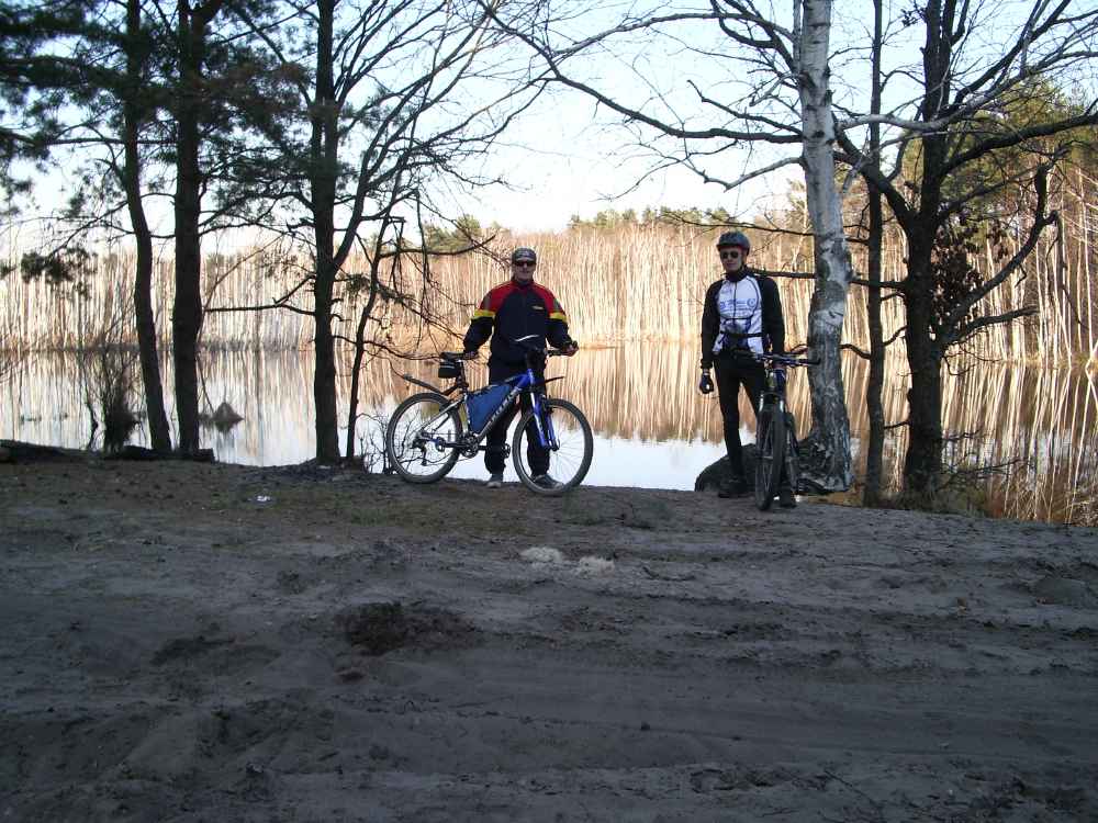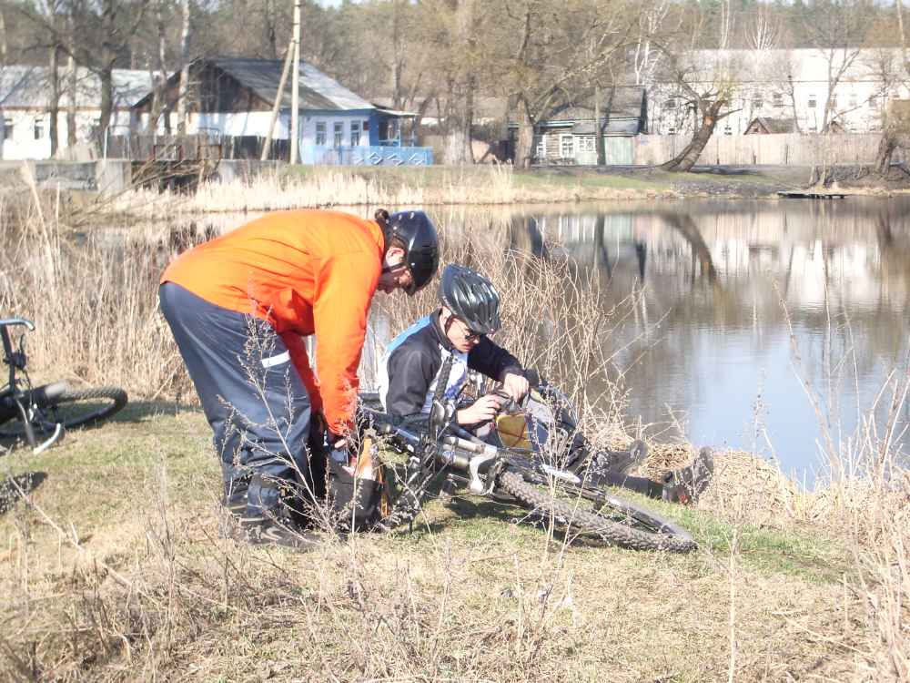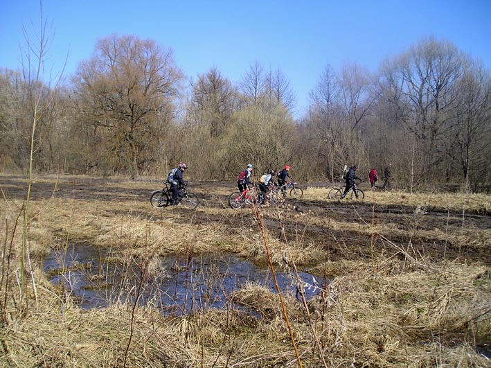 Анненские мосты, как таковые, были приятным , но коротким этапом 140 километрового пути по Центральному черноземью. Две трети этого маршрута были гм… слабоасфальтированы. В том, что это черноземье, отдыхающие убедились сегодня еще один, сильный раз. Любителей истошного отдыха у Шланг Баума собралось примерно с десяток: Rangifer, 460, Inokoff, konalex, Nedjmdin, Radler, Zheny и еще один, откликавшийся на Двоекса. До Чертовицка доехали через мостик, без приключений и с большим удовольствием. В Чертовицком сельском маге к нам в компанию пытался записаться чертовичанин 62 лет от роду и с утра уже улучшивший свое здоровье, которое он дальше собирался спасать в нашей компании. Оставили ему адрес велосекции и поехали дальше. От кладбища в Староживотинном по логу начали спуск в пойму Воронежа. Там рядом с автомобильной колеей идет мото – вело тропинка. Она то взбирается на склон, то спускается к колее. Катить по ней – одно удовольствие. Правда перед этим пришлось форсировать ручей, текущий по логу. Zheny прямо в ручье сделал фронтфлип через руль, что было бесстрастно зарегистрировано фотоаппаратом на батарейке. Перед этим он сделал тренировочный фронтфлип еще в деревне, но тогда в анналы не попал. Спустившись в пойму, обнаружили, что она полна жизнью. В болотах урчали тонущие джипы, дороги были превращены в месиво. Под высоким берегом поехали к Айдаровскому логу. Там жизни было еще больше. Оказалось, что проходит этап чуть ли не кубка России по говномесу на самодвижущихся повозках. Все болота были заняты этими повозками, которые с помощью лебедок вытягивали сами себя из безвыходного положения в которое сами же себя и поставили. Наши, не издававшие урчания, но не менее вездеходные бициклы привлекли положенное внимание. Поехали дальше через пойму. Все пойменные озера и болотца были полны воды и местами вылезали на дорогу водяными языками. Джипами это было перемешано в жидкие говны полуметровой глубины. Вот мы и полезли все это штурмовать. Не без потерь. Многие промочили ноги, испачкались. Rangifer вобще упала набок, правдв не в грязь, а в ледяную воду. В конце концов выехали к Воронежу в месте впадения Усманки на другом берегу и через Путь К Себе попали на рамонский мост. Коналекс дальше с нами не поехал, а отправился домой кормить пса. Все остальные доехали до Бора, перешли через железку и тайными тропами через заповедник двинули в Пчельники. После моста через Ивницу начались достопамятные пески. Спасло то, что они еще не полностью оттаяли. И ехать было легче, чем летом. Через мертвую деревню Пчельники поехали в сторону Беляево. На мосте через р.Студенку остановились и долго наблюдали небольшую щуку, спускавшуюся вниз по течению. После моста сразу свернули опять в заповедник и двинули на Чистое озеро знакомой тропой. Еще раз форсировали Ивницу. Видели косулю. Дальше - Графская и Анненские мосты. Компания Метеора еще не появлялась. Зато на месте была группа СергеяП. Поели сосисок, пообщались. Стоять на месте было холодно, солнце клонилось к закату. Поэтому собрались и по шоссе от Приваловки двинули обратно. До Бабяково успели до темноты. Тут обнаружилось что вел подо мной как то странно вихляется. Я даже подумал, что лопнула рама. Оказалось – спустило колесо. Клеить было лень, поэтому подкачивая поехал дальше. Зря, как оказалось. На сдувшемся колесе получил еще один пробой. Вста