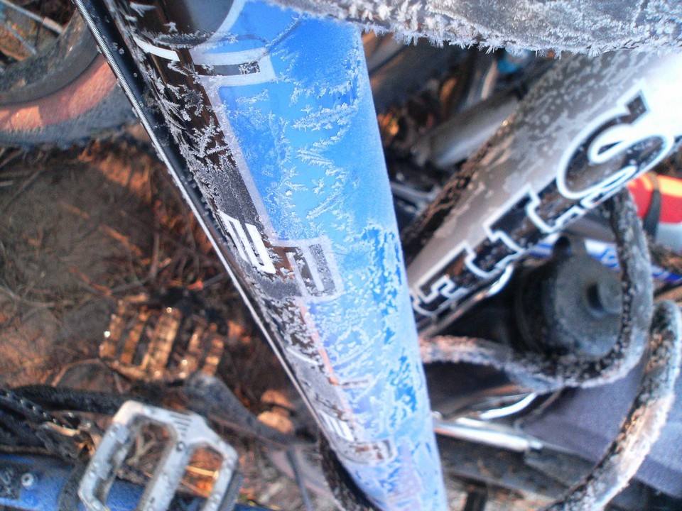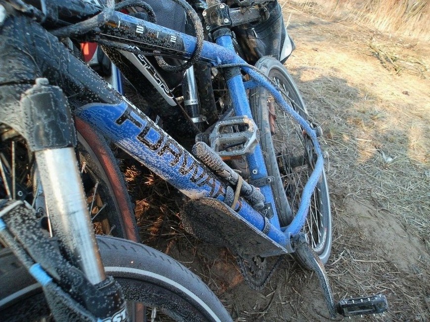 Всё покрылось инеем, трава, деревья, велосипеды и даже их хозяева