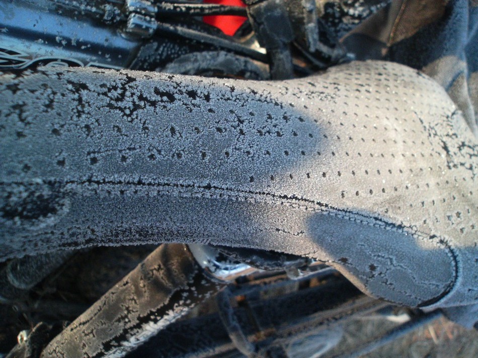 Но мы проехали по соседнему переулочку дач, который был перегорожен железным забором. Через забор перелезли, байки перетащили... Дальше был лес с подмороженными говнами, весьма проезжабельными. Заметили там несколько следов от вело (видимо авторов фото).