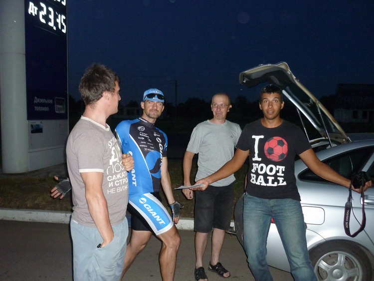 Все таки доехали до автостанции в Обояни и напали на чай и выпечку в ларьке. Колено прошло после сидения на корточках около ларька, когда нога в этом колене максимально согнута. На выезде из Обояни прокололся Вован. 70 км до Суджи мне представлялись малореальными, хотя проехали всего 200 км. Вдобавок от кофе, апельсинов и изотоника начался дикий гастрит, который мешал ехать все оставшиеся 400 км и сдерживал общий темп. Выражение "тошнить по асфальту шестисотку" становилось буквальным. Развлекались покорением следовавших друг за другом тырчков. Догнав машину, обновлявшую разметку на дорогах, Радлер, с его обостренным чувством прекрасного, пользуясь случаем, побелил покрышки. К этому времени внутренние часы окончательно съехали. Было ощущение, что не 11 утра, а 5 –6 вечера. Километров за 15 до Суджи увидели двух рандонье, изучавших устройство шоссера, поставленного вверх тормашками. Это были БадАдмин и АлексХХЛ С помощью Вована изучение удалось превратить в ремонт и дальше поехали впятером, вызвонив Неджа, чтобы встречал в Судже. Так и вышло. С заправки нас выгнали, поэтому перекусывали на той же обочине где и год назад с Семеном и Любой. Дальше по маршруту лежало Коренево, куда поехали двумя группами, опережая друг друга. На тырчке перед Коренево мысленно отметили половину маршрута. Проехать еще столько же казалось фантастикой. Проклятый гастрит донимал. Вдобавок я прокололся. БадАдмин и АлексХХЛ проехали до магазина дальше, потом решили нас не ждать и ехать в Глушково, но прокололись сами и отстали. К этому моменту духота достигла максимума. Здорово парило. Вместо сауны, как в прошлом году, теперь была влажная русская баня. Рассмотрели при свете дня дорогу до Глушково. С самого Солнцево впереди бессменно ехал Вован. После Глушково и моста через Сейм начался 30-ти километровый участок, который в прошлом году мы ехали, выспавшись в Глушково на КП, а теперь вот ехали невыспавшись. Спуски и подъемы следовали друг за другом, а Рыльск все не появлялся. В конце концов, когда он появился, его уже не хотелось. Так всегда в жизни, а бревет – довольно точная модель жизни. Знакомый по 400-ке кусок от Рыльска до спального КП поразил яростно утоптанным какой-то техникой и посыпанным щебенкой аствальдом на подходе ко Льгову.. Про спальное КП на 450-м километре можно сказать:. лучше поздно, чем никогда. Олег и Хаджи с традиционным гостеприимством встретили нас. Есть особо не хотелось. Особенно мне. Поэтому прилегли и попытались часок – два поспать. Не удалось. Вован под предлогом доступа свежего воздуха, напустил в палатку комаров, сон был сорван, и мы решили ехать дальше. Тут подтянулись БадАдмин и АлексХХЛ . Бочаров, стартовавший утром , тоже был на подходе. Он демонстрировал впечатляющий темп. В быстро наступавшей темноте поехали на Конышевку. Въехали в нее как раз по истечении суток с момента старта. Предстоял длинный, нудный кусок до Фатежа, не предвещавший извлечения из него кайфа. Вдумчивый читатель, знакомый с моими отчетами о 200-ке, 300-ке и 400-ке, наверно уже заметил подвох. А как же Принц Проколыч? Вован кололся, я кололся, а Радлер? Неужели карму вычистил. И вот под покровом ночи на выезде из Конышевки это случилось. БАБАХ! По звуку сразу было понятно, что это не простой прокол. Обнаружили дыру, протертую в покрышке. Видимо результат резкого торможения при стол
