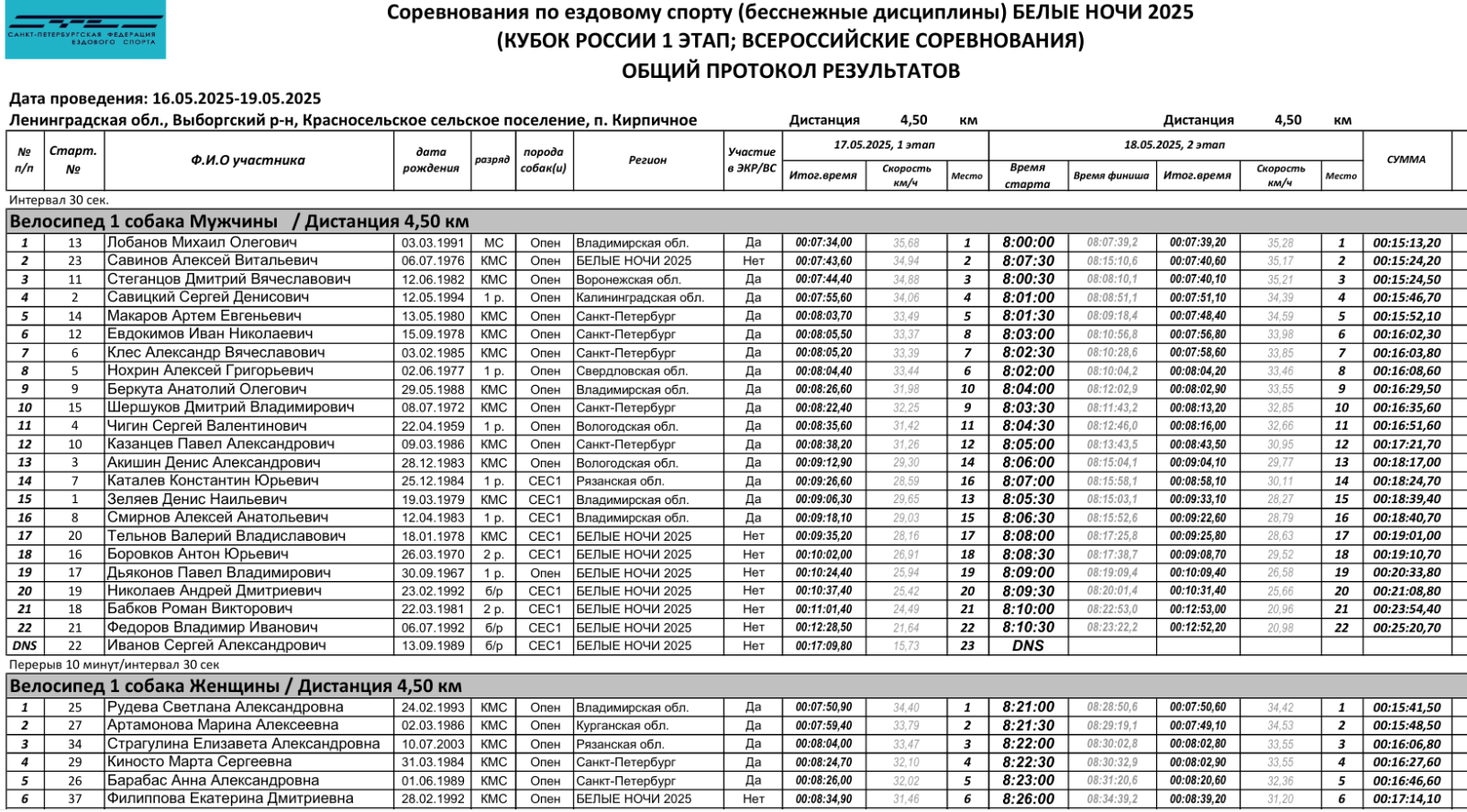На первом этапе Белых Ночей проехали мощно и хорошо, но, к сожалению, на последних 150м, увидев финиш, Зверь сильно сбавил, стал оглядываться. Именно на этих последних метрах поймали отставание, показав второй результат с +10с от первого. Очень обидно, подарили победу соперникам ((( Но это спорт, так бывает. На втором этапе улучшили своё время на 4с, показав среднюю скорость в 35кмч на 4.5км дистанции. Близко к пределу. Финиш Зверь добежал лучше, но всё равно немного сбавлял. На втором этапе первые трое финишировали в ОДНОЙ СЕКУНДЕ, и мы были вторыми из них. Вот такой сейчас уже уровень конкуренции! Гонки на предельных скоростях, секунды и даже доли секунды порой отделяют места на тумбе. В итоге по сумме двух этапов заняли второе место с +10с от первого.