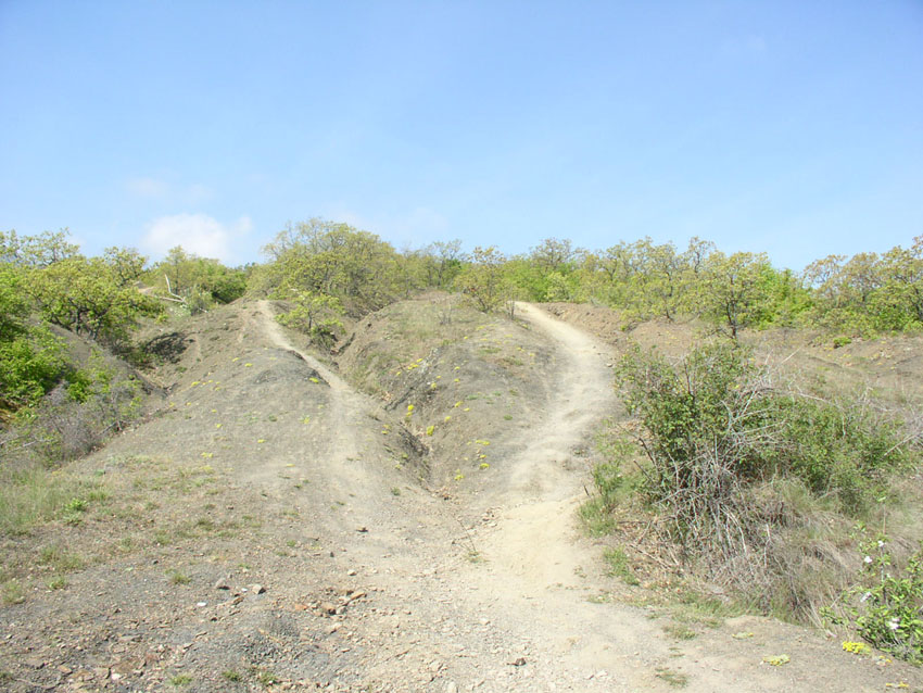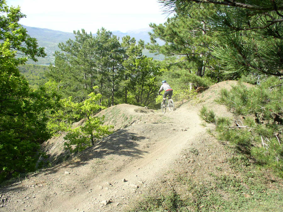 Алушта. Вылазием из троллейбуса озабоченные вопросом, легко ли будет найти на г. Ай-Йори место проведения соревнований, т.к. сами понимаете гора она большая и вся покрыта лесом. Никаких плакатов или опозновательных знаков, но на нашу удачу недалеко от остановки сразу видим райдера в полной downhill амуниции. Обращаемся, райдер снимает шлем и о как! оказывается женщиной лет 35 (ну мне так показалось) и как то немного будто из другого мира, медленно, о чем то другом паралельно думая пытается сформулировать дорогу. Ну что то (немного) понятно, можно купить еды на день и идти искать. Вернувшись из магазина райдершу уже не застаем на месте и начинаем идти по городу в указанном направлении. Мне приходит мысль что дети лет 10-15 наверняка должны знать про такое мероприятие и вообщем то да, пара пацанов подтверждает что мы идем правильно и даёт дальнейшие уточнения маршрута. Выходим к окраине города, сзади нас один за другим догоняют участники и мы понимаем что вообщем то вот что мы ищем -- надпись означает Finish / Alushta Cup!