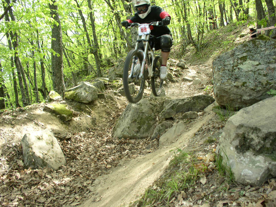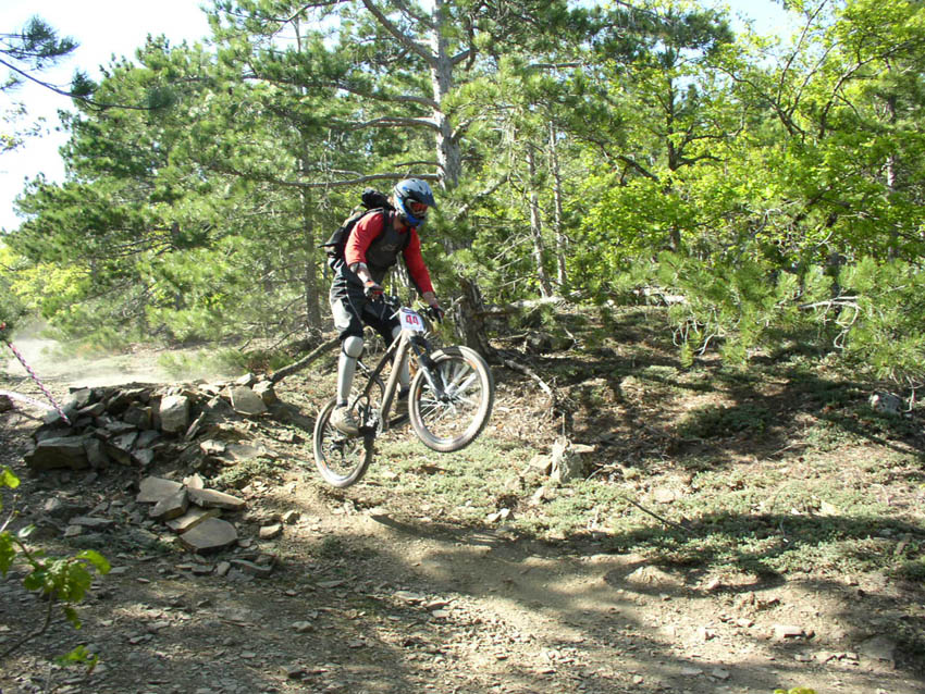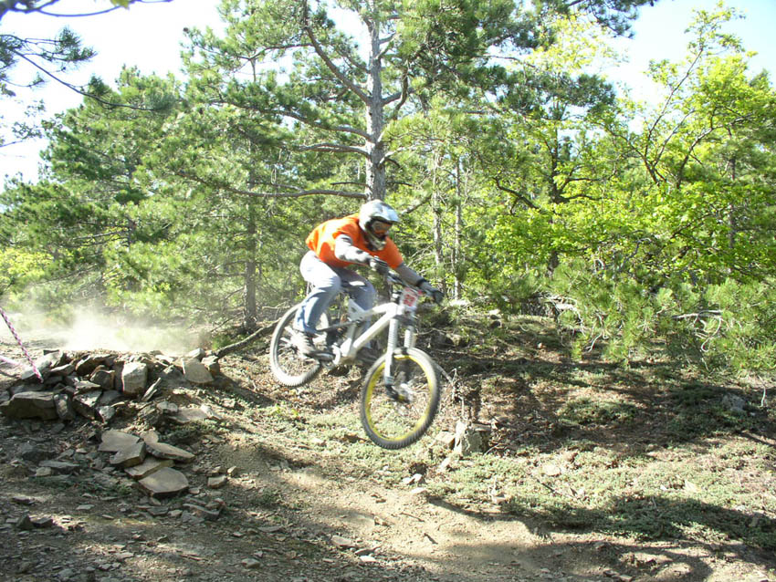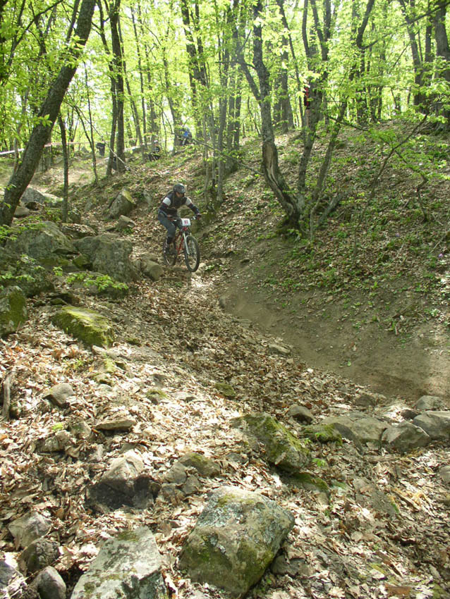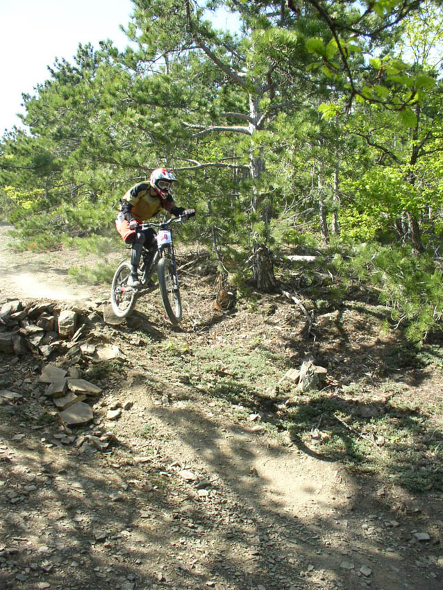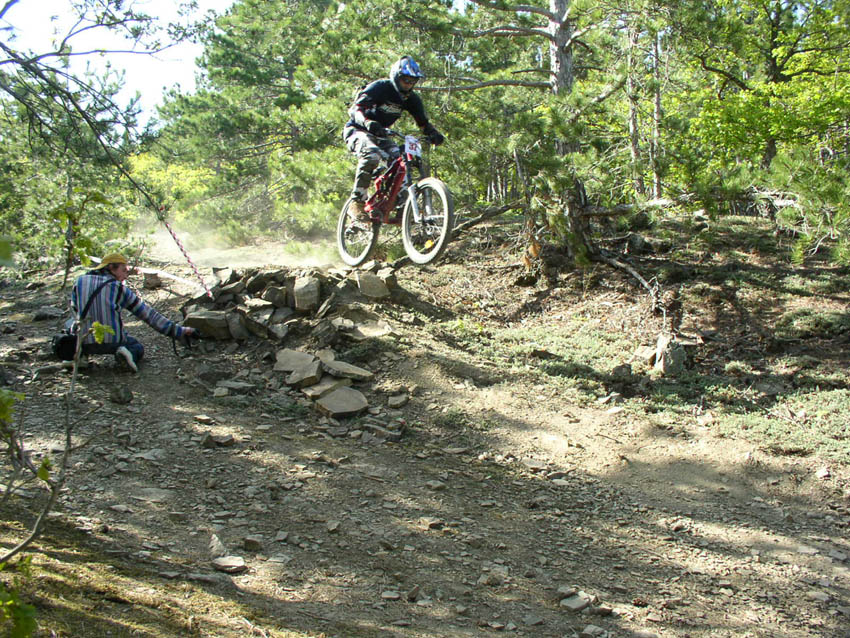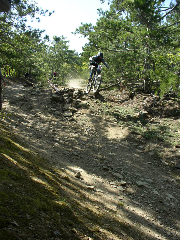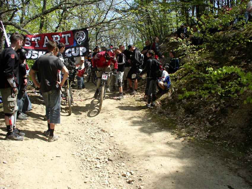 Ну и вот наконец старт -- куча народа (участников было около сотни), некоторое количество зрителей (как не странно, зрителей меньше чем участников), человек 10 с солидными фотоаппаратами. По регламенту сначала должны были идти девушки, потом юниоры, потом опытные райдеры, сначала те что без квалификации, а потом по рейтингу от последнего места к первому, т.е. тот кто выиграл в том году болжен был спускаться последним. Разрыв старта для девушек и юниоров 3 мин, для опытных 2 мин. Так, посмотрим на этих загадочных девушек которые участвуют в таком опасном виде спорта… Пройдя всю трассу снизу вверх, видя все эти трамплины, камни и прочее хочется им сказать: "Зачем, да бросьте, это же и правда может легко кончится переломом, сотрясением или чем то таким же нехорошим.. Оставьте это пацанам!" Но девушки стартуют достаточно неторопливо и возникает уверенность что скорее всего они доедут..