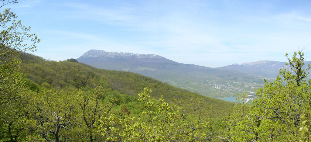 А да, велы мы не взяли ввиду большого количества переездов-пересадок и на самом деле они только бы помешали нам посмотреть соревнования. Едем на тролейбусе, он проезжает по достаточно высокогорной части Крыма -- на вершинах гор все еще лежит снег (честно говоря было неожиданностью):