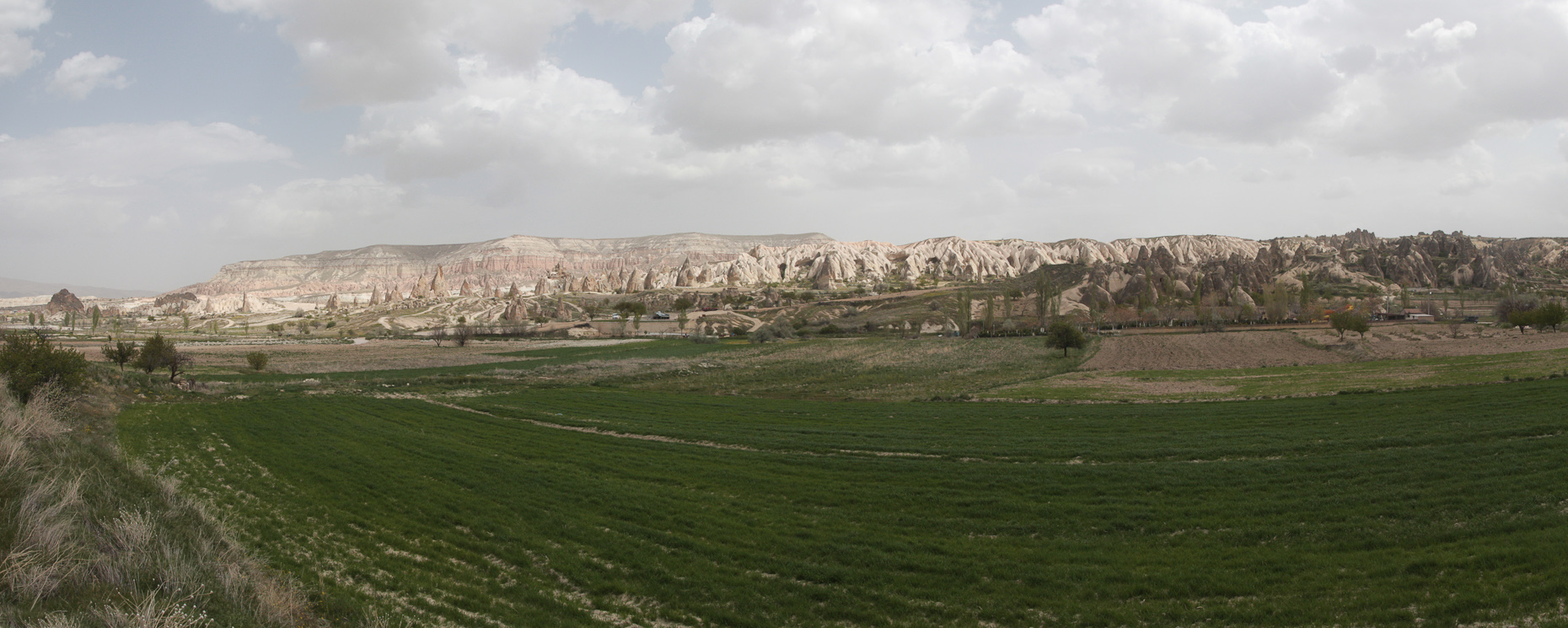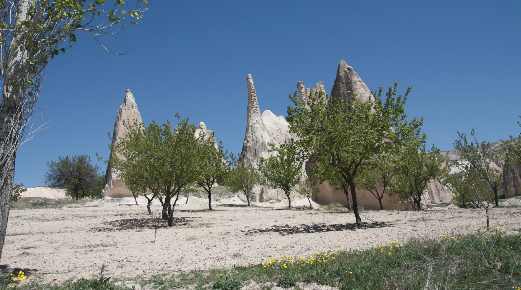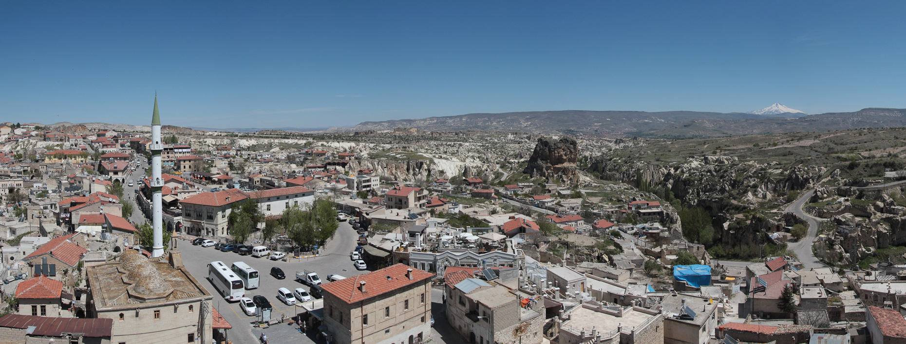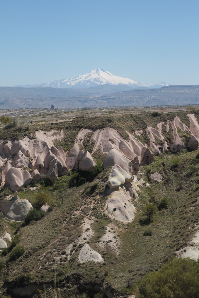 Вдалеке виден стратовулкан Эрджияс, 3917 м. Возможно он тоже участвовал в том, чтобы засыпать Каппадокию пеплом, из которого образовался этот необычный ландшафт.