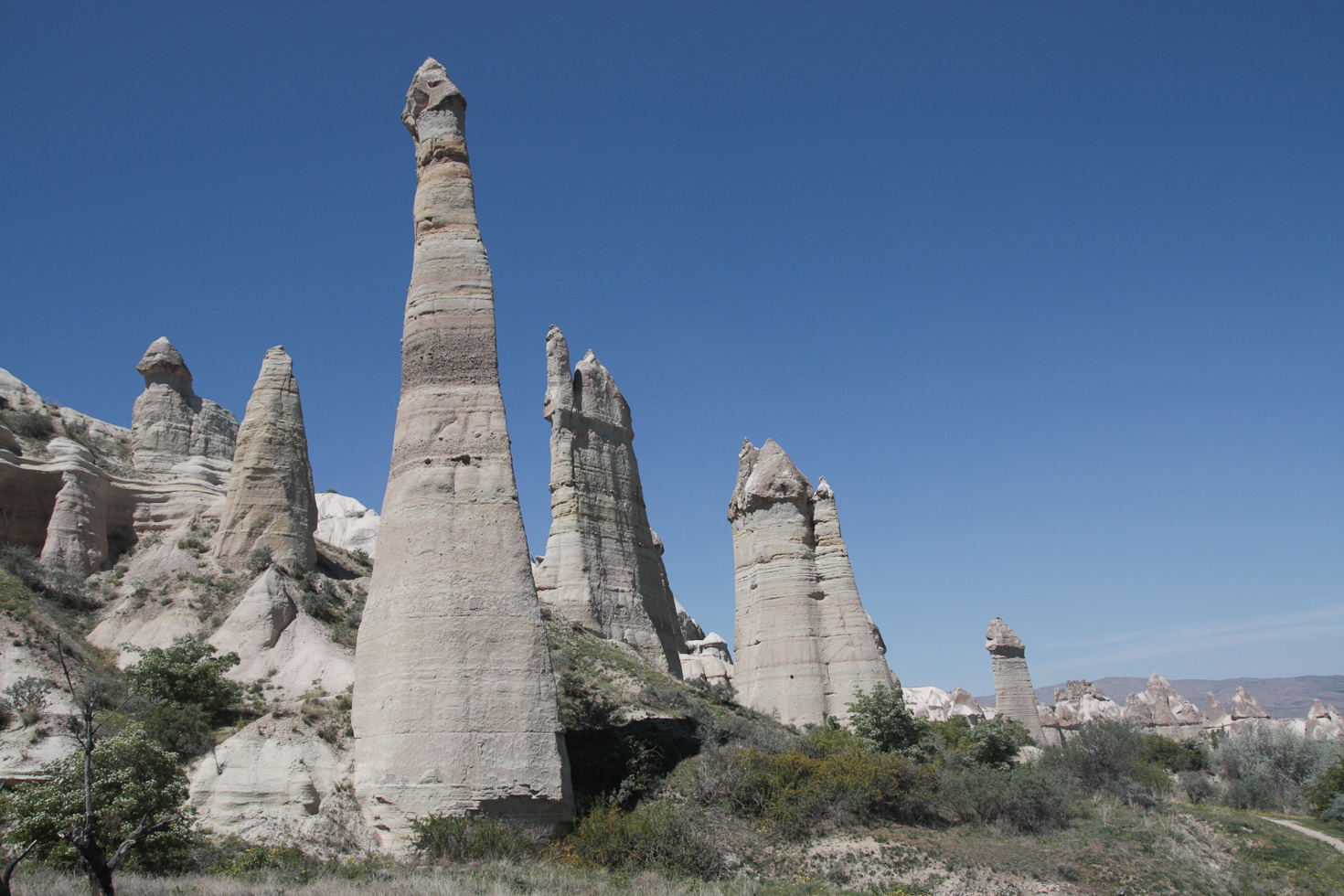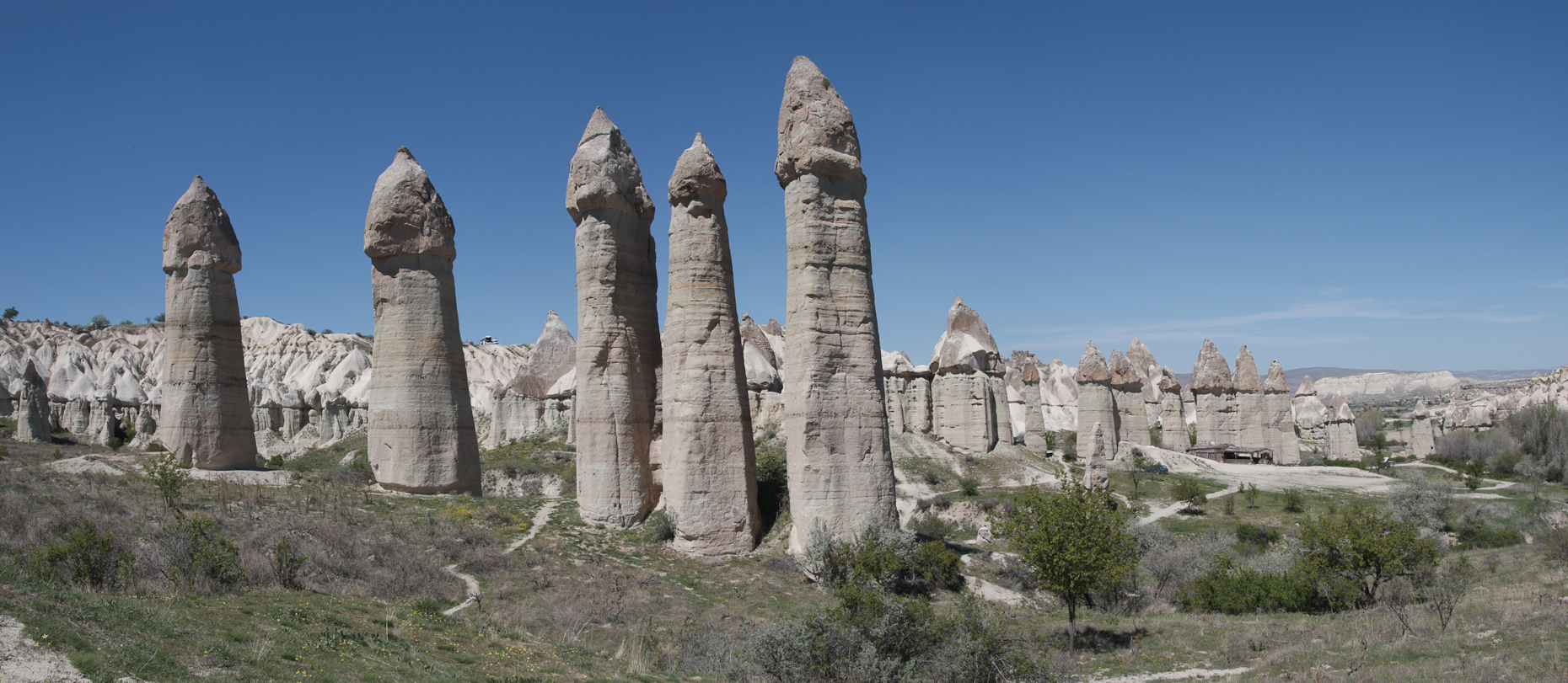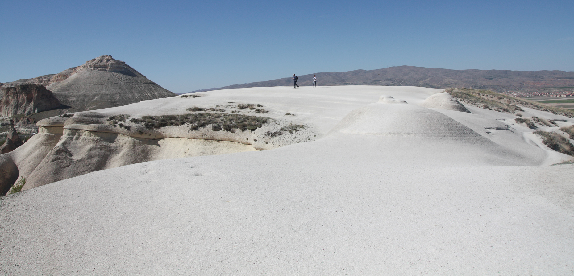 Вдалеке виден стратовулкан Эрджияс, 3917 м. Возможно он тоже участвовал в том, чтобы засыпать Каппадокию пеплом, из которого образовался этот необычный ландшафт.