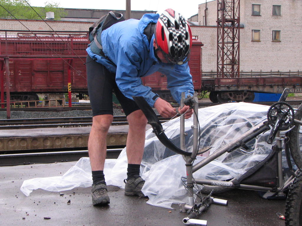 Тент покупной, материал - терпаулинг (это плетёный пластик, чуть сплавленный под давлением, из такого делают днища дешёвых палаток) очень лёгкий, с металическими люверами получается даже легче чем толстая поэтиленовая плёнка аналогичных размеров, диаметр лювера и расстояния между ними замеряю сегодня вечером дома, так не помню. Такие тенты различных размеров (у меня 2х3 метра за 180 р. - этого свехдостаточно для упаковки велосипеда, натягивания над стоянкой в случае дождя или укрытия 4-6 велосипедов от дождя же на ночь) у нас продаются в спортивно-туристических магазинах, а варианты из менее качественного китайского терпаулинга (рвутся быстро в местах где углы частей велосипеда изнутри упираются в тент- у Наты такой сейчас), но ессесно более дешёвые продаются на всяких оптовых, вещевых и т.п. рынках. Думаю, у вас в городе и те и те можно так же спокойно.