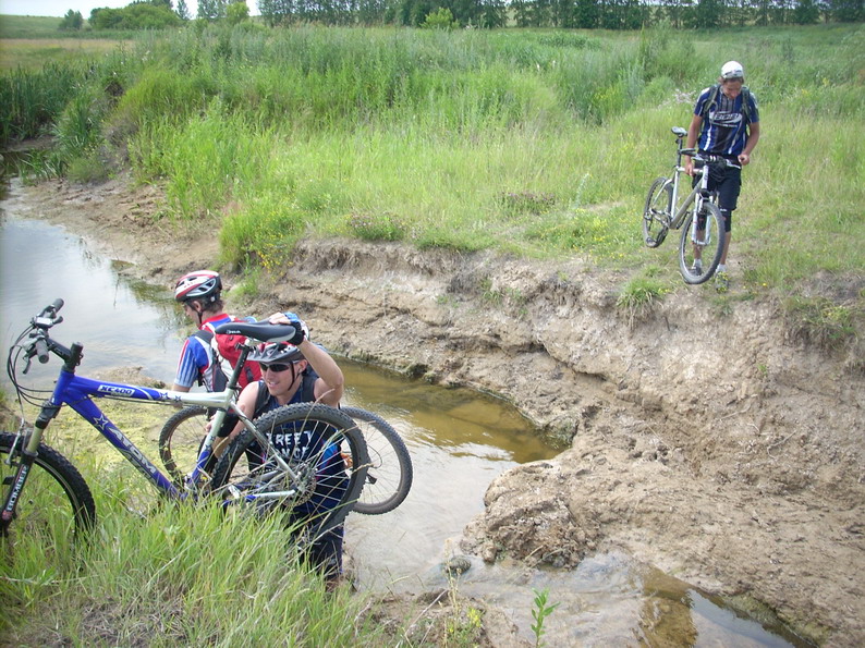 Первая половина маршрута туда повторила наш весенний путь через Новую Усмань, Рыкань, Волну, Михаиловку до саратовской трассы. Грунтов на этом участке было немного. На лугу около Усманки под Рыканью встретили настоящего аиста. Выехали на саратовскую трассу и проехали по ней, мерзкой, в лыжню раскатанной ровно 10 км в сторону Анны до колхоза "Дружба" (на карте Капканчиковы Дворики). Там свернули на грунт и горохово - ячменными полями через Красный Лиман двинули в сторону Большого Мартына. По пути переезжали две речки. Первую - Смычок (на фото) буквально перепрыгивали потому что моста через нее нет и автомобилисту, поверившему карте придется разворачивать оглобли. Вторая речка - Икорец ознаменовалась тягуном по пути туда, зато даунхиллом, о котором уже сказал ВоВка по дороге обратно. После Мартына, свернув не туда, штурмовали заболоченный овраг. Никто не погиб. Некоторое время ехали просто по траве, потом появилась заросшая колея, потом просто колея, потом грейдер, по которому в клубах пыли носились камазы с урожаем 2008 и от которых мы прятались в посадках. Тут мы приехали в Березовку, от нее асфальтом на трассу Анна - Бобров, по трассе в Шишовку, а уж от Щишовки даунхиллом вниз в хреновской бор, через который протекает Битюг. Дорога через бор до Вислого была на редкость разбита тракторами и почему то вся в лужах и грязи. Поэтому до Вислого 3 км.не доехали, а нашли стоянку на Битюге, где и принялись отдыхать около часа, а потом назад. Дорога назад показалась короче, потому что была уже знакома. Напрягали сгущающиеся тучи. Мысль о том , что ливанет посредине грунтов не грела, ведь пришлось бы километров 25 в любую сторону месить грязь до асфальта. К счастью дождь пошел когда до саратовской трассы оставалось метров 500. Мы в это время паслись на гороховом поле. Следующие 15 км асфальта до Рогачевки явились последним штрихом в придании нам юродивого образа. Когда я ввалился в Рогачевке в придорожное кафе за чаем по лицу продавщицы было видно, что она готова послать меня подальше. Тут ввалились остальные и она поняла, что это подстроено и сразу налила нам чаю. Рогачевка, которая живет трассой, скажу я вам прелюбопытнейшее место. Пока мы пили чай, лично мне не подвернулось ни одного нормального человека. Около нас молча ходил и заглядывал нам в рот какой то альтернативно одаренный. Мимо прошла особь женского пола непонятного возраста, завернутая в скатерть вместо юбки. Шоферов тоже нормальными трудно назвать. Да и наш вид прекрасно гармонировал с аурой этих мест. Выпитый чай подействовал на всех по - разному. Меня начало колбасить,скорее всего от атмосферных явлений, к которым я чувствителен крайне. Зато зажег 460, который сел на своего железного коня с карбоновым теперь рулем и до Воронежа держал сороковку. Мы с Вовкой пытались висеть у него на колесе, но лично я был близок к потере сознания. Женя отстал перед Новой Усманью. В Воронеж въехали втроем и после чернавского моста разъехались восвояси. Такой вот поход вышел.