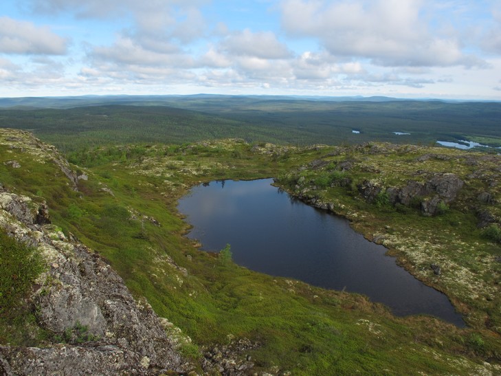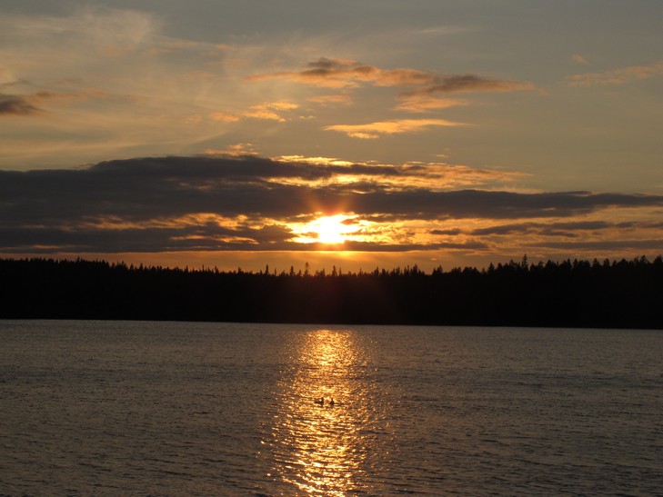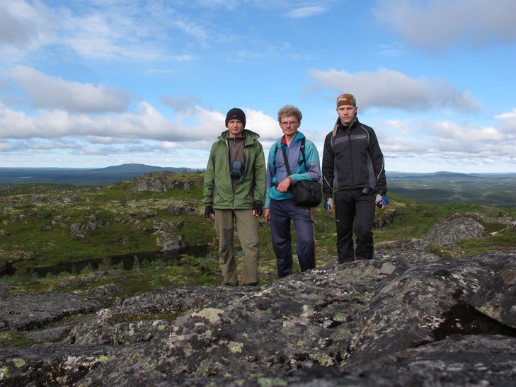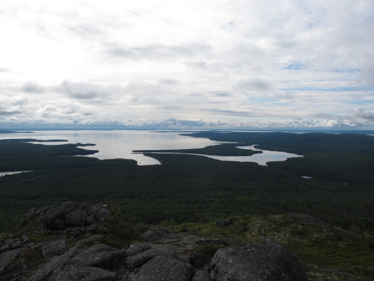 23.06 С утра еще одна пеше-велорадиалка - на гору Кивакка (499 м). Это еще 25 км. Гора не самая высокая (высшая точка Карелии г. Нуорунен (576) также находится на территории парка, но до нее 25 км пешком в одну сторону), но самая доступная и очень красивая как сама по себе, так и в плане открывающихся видов. Погода радует, солнышко светит, тепло. Поторчав на вершине, возвращаемся в лагерь, собираемся и двигаемся дальше по маршруту. Ночуем недалеко от пос. Пяозерский. Впервые видим долгожданное полуночное солнце, правда, только на верхушках деревьев.