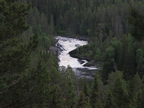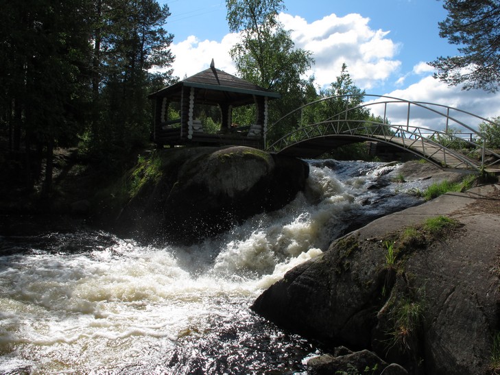 26.06 С утра смотрим на водопад: он очень высокий, но ступенчатый и не просматривается целиком. В смысле расхода воды уступает, конечно, Кивакке. Местные утверждают, что высота его составляет 14 метров и что он является самым высоким водопадом в Карелии http://www.voinitsa.ru/pages/art12.aspx