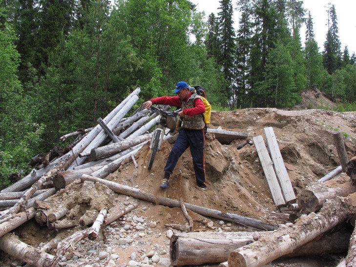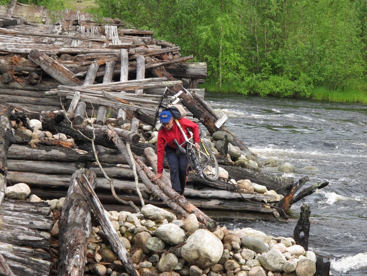 25.06 Едем утром с Димой в погрануправление за пропусками, затем в полицию по поводу потери документов. Потеряв где-то полдня, договариваемся, что справку о потере документа ему выдадут, я сдаю Диму своим знакомым на постой на 2 дня: он решает ехать на автобусе в Кемь и восстанавливать ж/д билет, а автобус 1 раз в день. Возвращаюсь в лагерь, уже вдвоем с Владимиром едем навстречу приключениям по маршруту, который я набросал, глядя на спутниковые снимки гугла, а Дима вбил в навигатор. Приключения встречают нас сначала в виде дождя, а затем в виде сожженного моста через крупную реку Писта. Между пролетами моста перекинуты отдельные бревна и жерди, пройти налегке можно, держась обеими руками за бревна. Решаем разбирать велосипеды и переносить барахло по частям, так, чтобы руки были свободными. Минут через 40 мы на другом берегу. Едем дальше, дорога сначала хороша, затем заметно хилеет, изобилует следами медведей, медвежат, волков, лосей, становится стремно, да еще и дождь. А причина ухудшения впереди - еще один разрушенный мост, на этот раз через небольшой ручей. Там все проще. Цели сегодняшнего дня достигаем в 22.00 - стоянка на высоком обрывистом берегу реки Войница, внизу шумит водопад Куми. Ехали 8 часов без обеда, на ватрушках, купленных в Калевальской столовой. Очень вкусные ватрушки, особенно с брусникой и черникой.