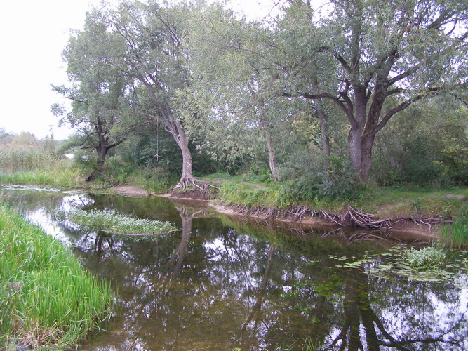 Жил я на деревне у дяди с тетей . То есть у родственников. Они купили у староверов дом и сделали евроремонт. Отсюда я и ездил повсюду, несмотря на дожди. Даугавпилс находится на широте Москвы. Чернозема там нет и в помине. Есть песок и галька от ледника. Глина кое где. Много улучшенных грунтовок. То есть расширенных грейдером и засыпанных этой самой галькой. Машины все это укатывают в стиральную доску. Поэтому, когда едешь мелко вибрируешь. Даже вилка не все глотает. А говен нет. Как то не по себе даже. Мрачная погода инспирировала соответствуюшие комментарии к картинкам. Полноценных покатухи удались только две, по 150 км. каждая. Сел как то утром на велосипед и поехал в недалекую Литву. Переходил границу по шпалам железной дороги С.Петербург – Варшава. На литовской стороне в 200 метрах от границы, по перрону станции Турмантас прогуливалась полицейская (в смысле женщина – полицейский. Или пограничник). У нее за спиной прошмыгнул в город. Могли бы и повязать. Несмотря на шенген, вроде бы разрешается переходить границу в специальных пунктах перехода. Обратно переходил в таком пункте в Зарасае где и сделал снимки. С обеих сторон в джипах сидели литовские и латвийские погранцы, но интереса не проявили. Из войск НАТО видел только старый грузовик литовской армии из которого выпрыгнул солдат и пошел за сигаретами. Присутствие НАТО ощущалось в виде ветра , дождя и непрекращающихся попыток погоды сорвать покатушку. Из Литвы, дав хороший крюк по лесам и озерам, вернулся на базу. По дороге занимался фотографированием всех встреченных гнезд аистов. Полученный материал готовится к обработке. Другая большая покатушка была в католическую мекку Латгалии – Аглону. Помимо аистиных гнезд, фотографировал все придорожные распятия, коих там (хотел сказать до черта). Надо сказать, что езда по уже упомянутым улучшенным грунтовкам сильно выматывает. Еще и холмистый рельеф сказывается. А вот и грунтовочка видна: Изгиб крыши, видать ,просчитывали с помощью ЭВМ. Это по дороге из Аглоны. На том же маршруте: речка Дубна: Как то вечерком захотелось печеной катрошки. Взял лопату, пошел во двор. Было темно, грядку не видно. Промахнулся на 25 см. Вместо картошки попадались одни булыжники такого же размера и формы. В общем , крестьяне там не избалованы черноземом. Из выковыренных на полях булыжников строят амбары и даже церковь построили: