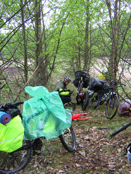 Утром стало отчетливо ясно, что от дождя нам не уйти в любом случае. Хорошая новость состояла в том что на том берегу ждали максимум пески и говен лишь самую чуточку. Так что не теряя времени посушили палатки и шустро покатили на север, к дому. Дождь накрыл нас уже на другом берегу на въезде на говняно-песчаный участок. Пески мы постарались преодолеть по обочине по травке, за что и поплатились массовым проколом, я так вообще проколол оба колеса да так что трижды разбортировали и искали новые дырки покуда мы с Вовой колдовали над моими колесами, остальные развели мини-костер и упаковались в дождевое облачение. Впоследствии и я опробовал, наконец, бахилы и дождевик в полевых условиях. Говна начинали ощутимо набухать и перед Крицким у Freemana начало клинить колеса, и вдобавок я словил колючку в заднее колесо. Вел опять поплыл и опять разборка-ремонт-сборка. Запаска встала в переднее колесо еще в полях, дальше я решил обходиться заплатками насколько будет возможно, ибо на группу оставалось всего 3 запаски. Без потерь из полей вернулся Курск, который пер по пескам, Monah, у которого стоял бронебойный полуслик, и ainu, заливший предварительно в колеса герметик. Дождь продолжал полировать окрестности, но увы – мы уже вышли на камешник переходящий в асфальт и шансов ему не оставляли в принципе. Правда в магазин в Лосево мы все равно опоздали. Пришлось затариваться в придорожных лабазах. Зарядились на 2 дня автономки. Кроме прочего взяли на пробу сгущенку в полуторалитровой бутылке. Ниче так сгущенка в принципе, и легко пьется. А дождь все продолжал поливать. Поехали было к Покровке, и опять некто представившийся участковым попросил остановиться, где-то перед мостом через Битюг, попросил не нарушать безобразий на вверенном ему селе и свалил дальше. Потом через пару апхиллов нас ждало вознаграждение за мытарства – километров 10 плавного спуска. Есть на свете велосипедное счастье. В итоге на место стоянки прикоптили практически засветло. Мой костюм уже переставал справляться с потоками воды, а дождь и не думал униматься. Пока все ставили палатки и тент, я собрав все емкости и мощную рацию поковылял обратно в Покровку за водой. В поле уже начинало возить и на грунте и на траве, и лишь феникс пробивал толщу тьмы, вязкой как кисель. Спускался знаменитый покровский туман и обратно добираться приходилось едва ли не наощупь. Перегруженный бомболюк то и дело норовил развернуть вел под 45 градусов, ехал по полю по велосипедным следам чтоб не сбиться со скоростью пешехода. Слава злой резине.