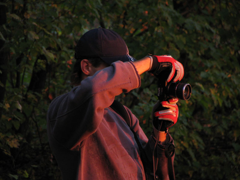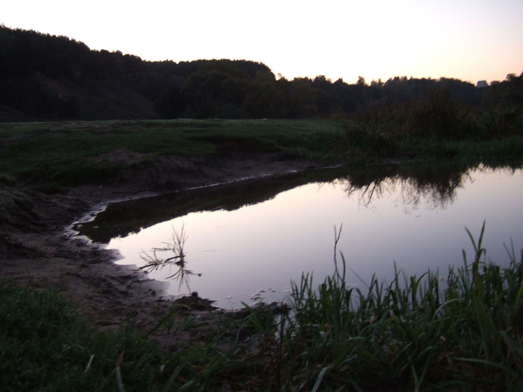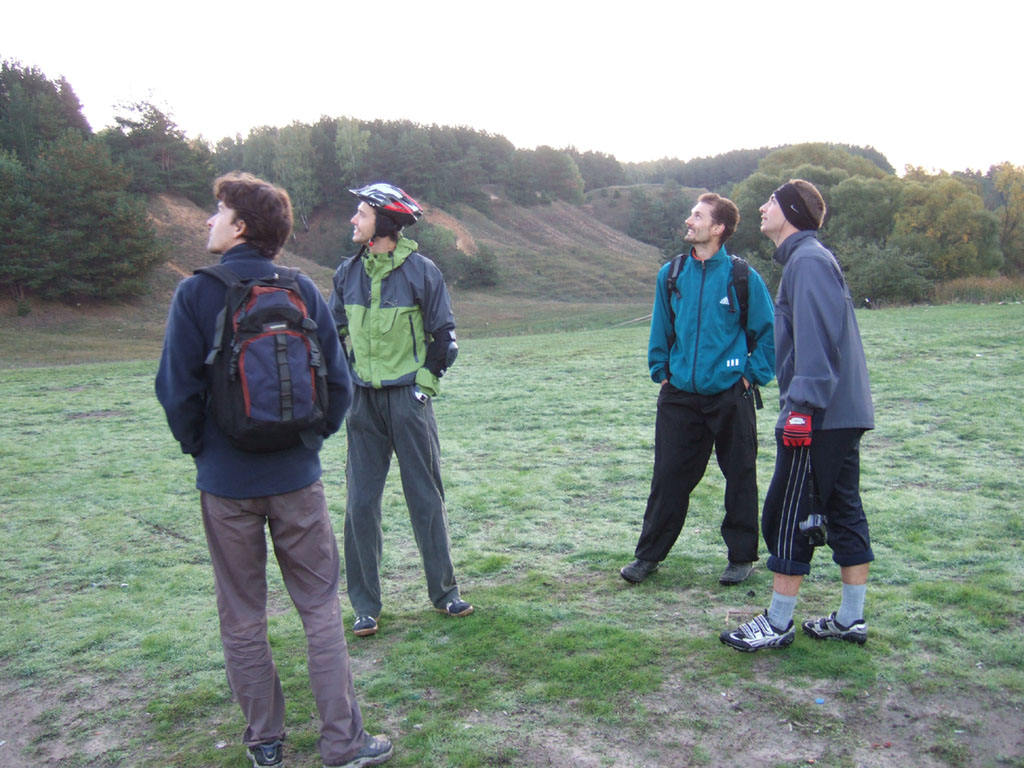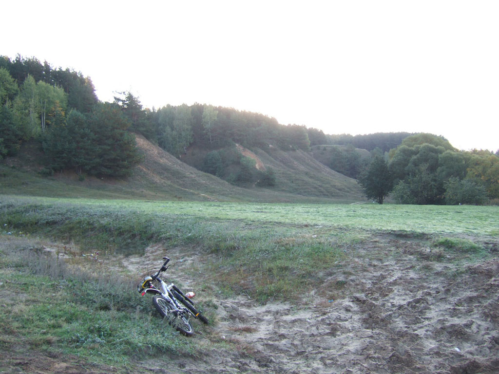 Проснулся я в 4.55, подкрепился и в 5.40 вышел на улицу. Когда выехал на ул. Плехановскую вдалеке увидел два велосипедных маячка и решил их догнать (зря...но, об этом после). Догнал их на пр. Труда - это оказались Euridica и Alexander_M. Вместе с ними доехали до памятника Славы и стали ждать. Подъехали еще двое - Semik и Владимир (по-моему Владимир, надо бэйджи делать или чинить память ). Мы вместе подождали Radlerа до 6.11 и, не дождавшись, уехали на озеро. Я и Владимир ехали без фары. В городе еще что-то на дороге видно, а в Подгорном было "весело" – темнота. Приехали на озеро, там темень и роса. Место для встречи рассвета, не очень удачное. Рассвет был по одну сторону холмов, а мы по другую. Время в ожидании рассвета коротали беседой и фотосъемкой.