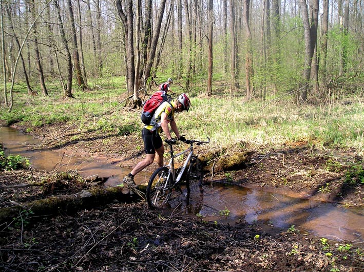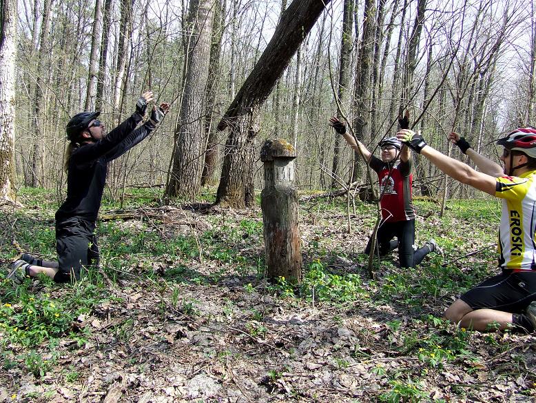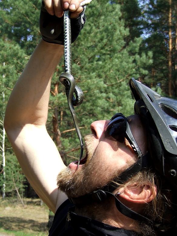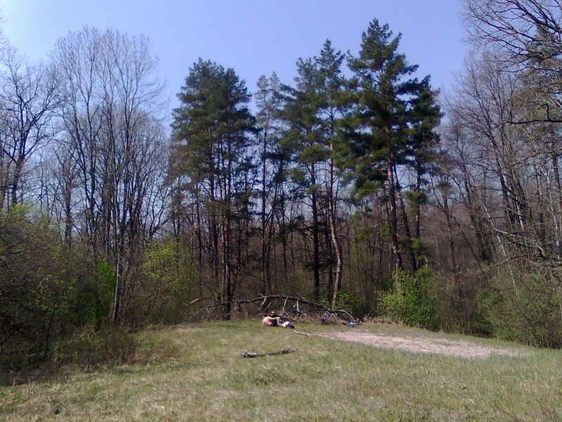 И так, выехав из Отрожки, группа из меня, Zheny и Radlera отправилась покорять очередные глубины Воронежского заповедника, предполагалось просто проехаться по отмеченной на карте дороге от станции Беляево и выскочить в Студенках, но когда мы переходили пути и собирались углубиться в лес, местный дедок указавший дорогу сказал, что мы непременно заблудимся. Воодушевленные мы двинули по тропе, которая постепенно из дороги плавно перешла в дебри тропического леса с отличным буреломом, поблуждав по заросшим просекам, вышли к лесному озеру и устроили привал на холме рядом. Далее по азимуту двинули пешком по дебрям, и вышли неожиданно на Ивницу которую и преодолели, перешагнув – перепрыгнув пока еще мосты через нее не актуальны, перейдя по бревну через мини болото вышли на просеку ведущую к потерянной ранее дороге на Студенки, судя по карте двигались мы в нескольких сотнях метров от дороги. До станции дорога идентична идущей на Графское, что вдоль путей. Обратно двигались уже на скоростях под 40, следов москвичей не обнаружили, зато было много ужей, некоторые из них попали на принудительные фотосессии, Спасибо всем участникам партизанского отряда.