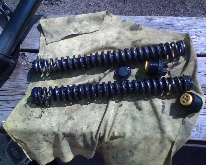 можно откручивать не за гайку а за сами крутилки прелоада, но так как у меня было не очень туго закручено, крутил за гайку и даже без тряпочки. резьба правая, откручиваем против часовой. вынимаем содержимое ног. можно продавить вилку чтобы было легче это сделать. внутри каждой ноги пружина с крышечками и эластомером внутри.