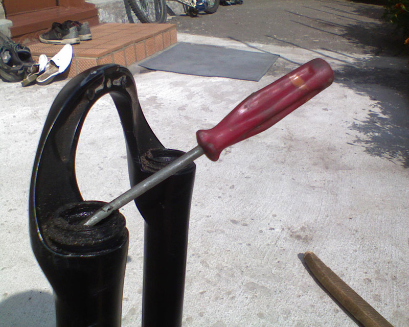 собираем вилку в обратном порядке. вставляем сальники в штаны, кладем туда проставки, вставляем ноги, вставляем штанги в ноги до упора чем-нибудь достаточно длинным, закручиваем болты снизу штанов, вставляем пружины в ноги, закручиваем крышечки сверху. без фанатизма, пластмасса очень мягкая.
