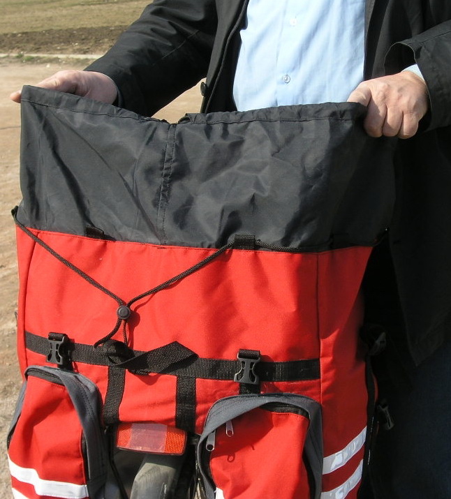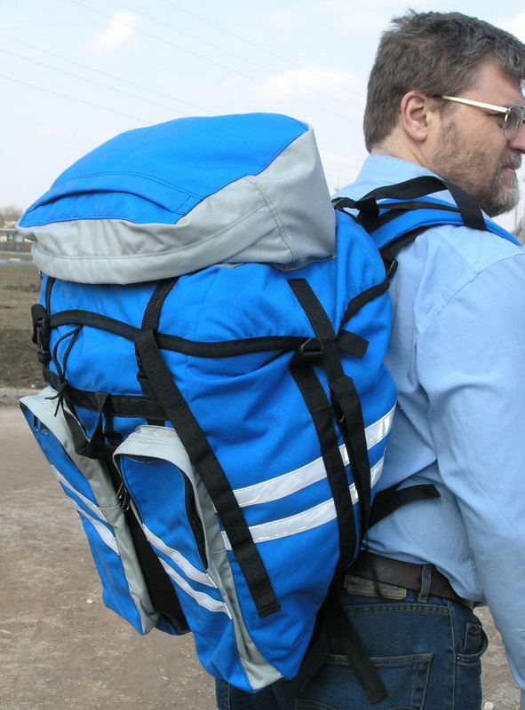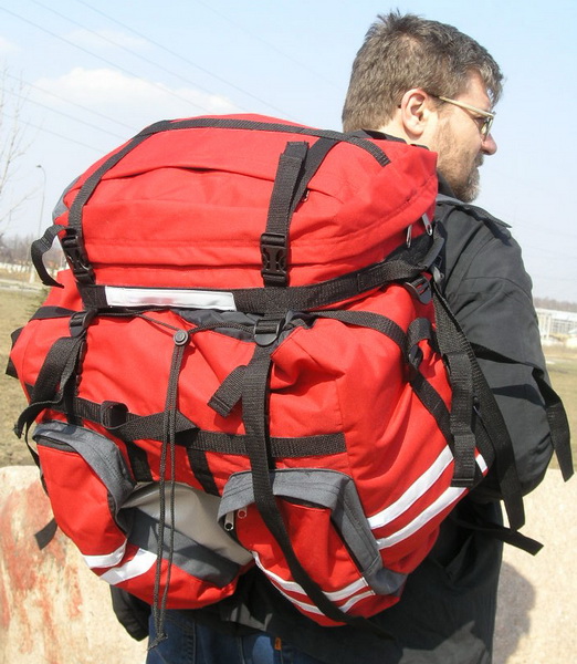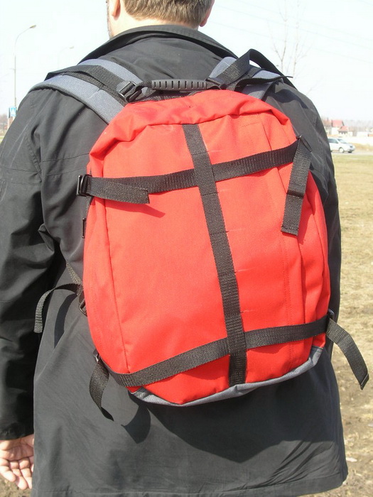 На снимках - красный рюкзак - модель "Вело-100-07" (2007 год, 100л). С верхним съёмным рюкзачком.