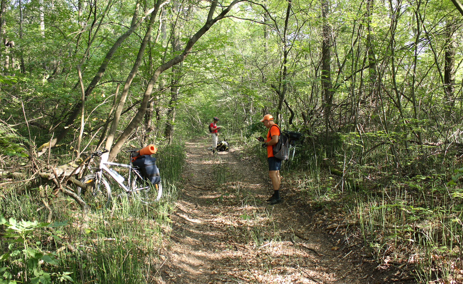 Дальше пошло асфальтовое путешествие, т.к. ходьба по песку в лесу уже надоела. Поддубовка, Боровое, Куликово -- все время у меня создавалось впечатление что я борюсь с попутным ветром, скорость никак не хотела повышаться больше 20 км/ч и мои спутники затрачивали явно меньше усилий на езду. Какое то время я думал на усталость, но потом все таки решил, что что то тут не так. Оказалось что у меня лопнуло две спицы на заднем колесе и образовалась огромная 8-ка. Расцепили заднии тормоза и поехали на ближайшую ж/д станцию Дрязги. Я поехал домой а Сергей и Роман продолжили путешествие. Ждем продолжения!